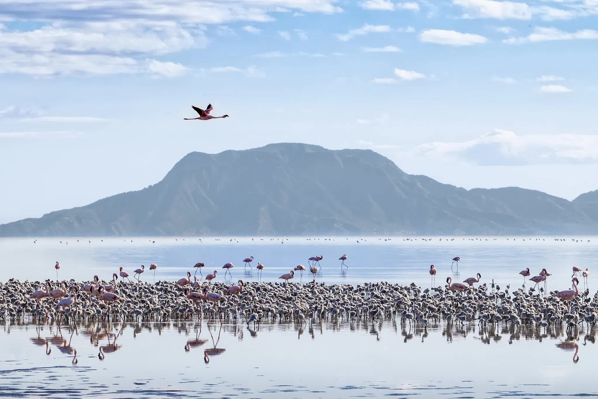 Tuy nhiên, giữa môi trường khắc nghiệt như địa ngục trần gian ấy, thiên nhiên vẫn tạo ra một nghịch lý kỳ diệu. Hồ Natron lại chính là nơi sinh sản quan trọng nhất của loài chim hồng hạc nhỏ (Lesser Flamingo).