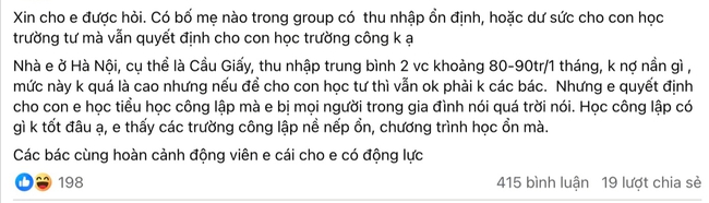Một bà mẹ chia sẻ: "Thu nhập nhà mình tháng ít thì gấp đôi, tháng nhiều thì gấp ba nhà bạn thân, nhưng con vẫn học công đây. Mình thấy hài lòng với lựa chọn của mình. Bé nhà chị học trường công gần nhà, sáng nắng chiều mưa đều đưa đón tiện lợi.