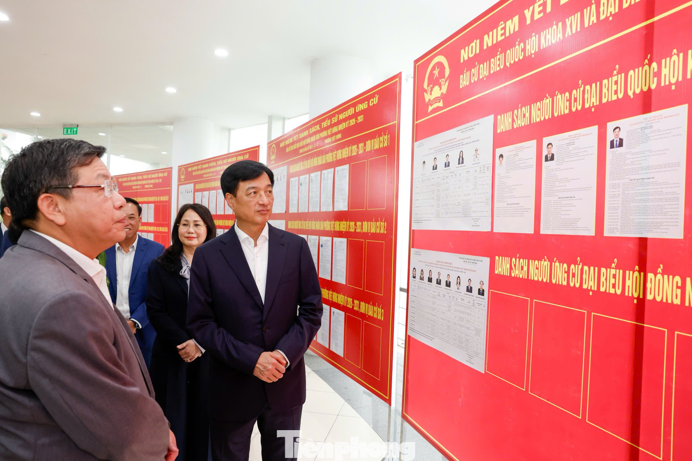 Bí thư Thành ủy Hà Nội Nguyễn Duy Ngọc kiểm tra việc niêm yết danh sách ứng cử viên và danh sách cử tri tại phường Việt Hưng. Ảnh: Như Ý.