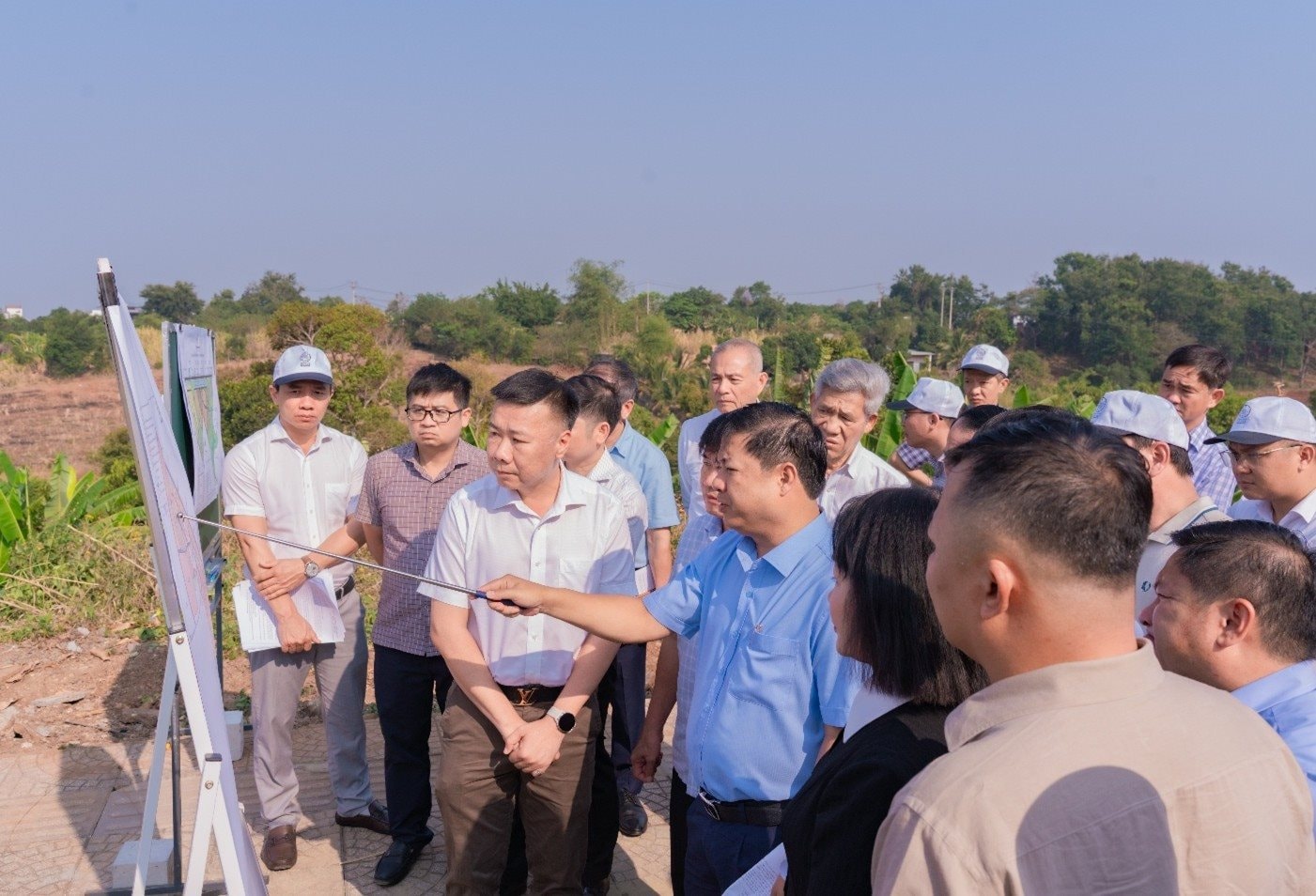 Bí thư Tỉnh ủy Đắk Lắk Lương Nguyễn Minh Triết (áo xanh, đứng giữa) khảo sát tại dự án Khu đô thị sinh thái văn hóa cà phê Suối Xanh, chỉ đạo các sở ngành tháo gỡ vướng mắc, tạo điều kiện để triển khai giai đoạn 2 của dự án trọng điểm này.