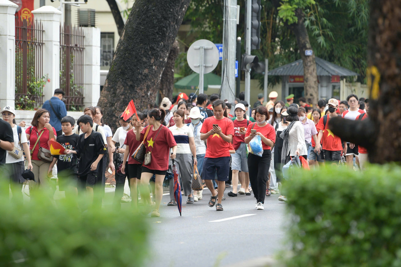 Từ đầu giờ chiều 27/8, người dân đổ về khu vực gần quảng trường Ba Đình ngày càng đông, phủ kín các tuyến đường quanh quảng trường. Không khí sôi động, háo hức chờ đón lễ sơ duyệt diễu binh, diễu hành lan tỏa cùng màu cờ đỏ, cũng những tiếng hòa ca trên đường phố.
