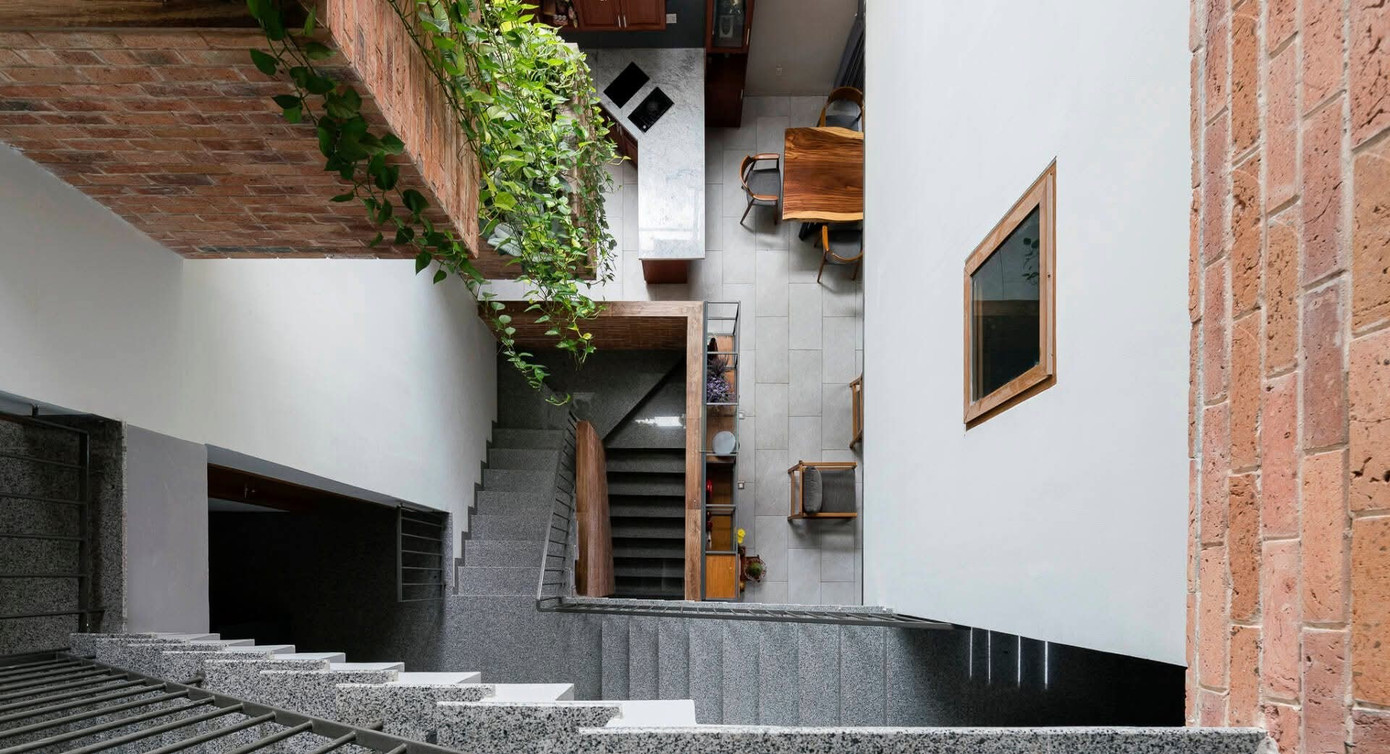 Trục đứng ngôi nhà được thiết kế cho thông khí và trao đổi ánh sáng tự nhiên thông qua các lối thang bộ bằng đá và thang xoắn ốc. Trên cùng là sân thượng rộng rãi và xanh tốt.