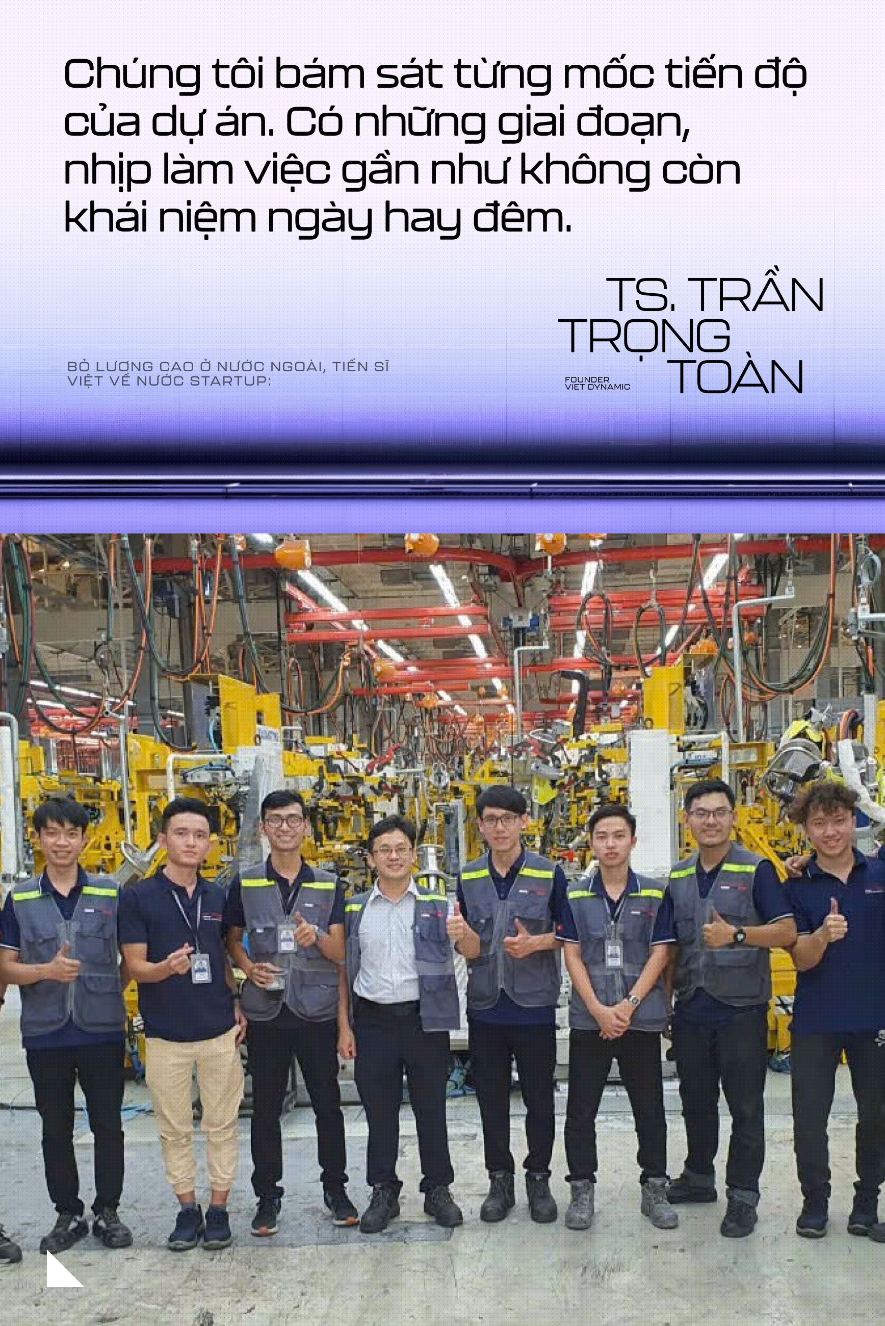 Từ những suy nghĩ ấy, anh cùng một người bạn cùng lớp khi còn học ở Nga quyết định thành lập Viet Dynamic với khát vọng góp phần giải bài toán nhân lực kỹ thuật, tạo việc làm và tạo ra giá trị thực cho xã hội. Những ngày đầu khởi nghiệp diễn ra trong điều kiện thiếu thốn trăm bề: văn phòng phải đi mượn tạm, công việc triển khai trong những nhà xưởng nóng bức, bụi bặm và tiềm ẩn nhiều rủi ro. Nhưng chính từ những điều kiện khắc nghiệt đó, một đội ngũ kỹ sư trẻ bắt đầu hình thành, từng bước xây dựng năng lực và đặt những viên gạch đầu tiên cho một doanh nghiệp công nghệ Việt Nam trong lĩnh vực tự động hóa.