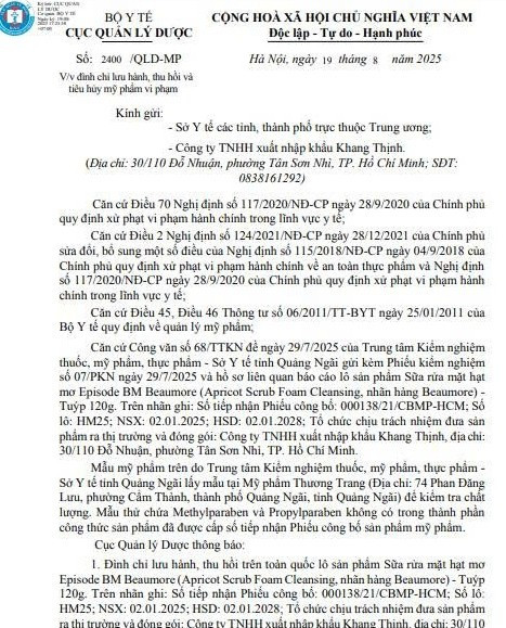 Cụ thể, Cục Quản lý Dược thông báo đình chỉ lưu hành, thu hồi trên toàn quốc lô sản phẩm Sữa rửa mặt hạt mơ Episode BM Beaumore (Apricot Scrub Foam Cleansing, nhãn hàng Beaumore) - tuýp 120g. Trên nhãn ghi số tiếp nhận Phiếu công bố 000138/21/CBMP-HCM, số lô HM25, NSX 02/01/2025, HSD 02/01/2028. Sản phẩm do Công ty TNHH xuất nhập khẩu Khang Thịnh, (địa chỉ: 30/110 Đỗ Nhuận, phường Tân Sơn Nhì, TP HCM) chịu trách nhiệm đưa sản phẩm ra thị trường và đóng gói.