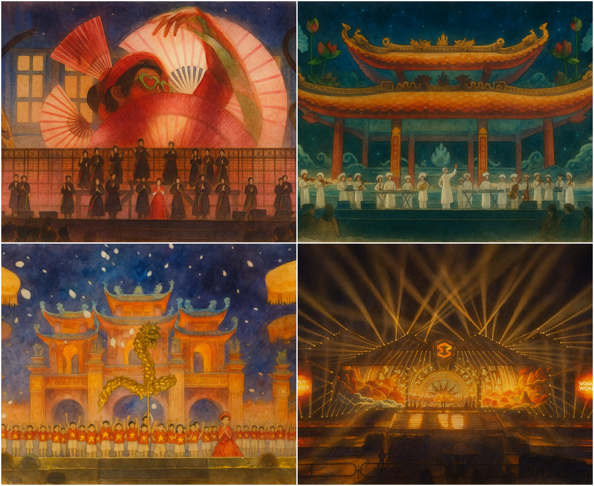 Trên sân khấu phủ 1.000 đèn LED, mọi chi tiết được tính toán để khán giả dù ngồi đâu cũng có thể tận hưởng trọn vẹn. Từ âm thanh, ánh sáng cho đến thiết kế visual, tất cả đều đạt chuẩn quốc tế, hòa quyện với dấu ấn văn hóa Việt. Hình ảnh núi Tản, mái đình, rồng thần, Lạc Long Quân… xuất hiện xuyên suốt các tiết mục, đề cao tinh thần tự hào dân tộc ngay giữa không gian toàn cầu hóa.