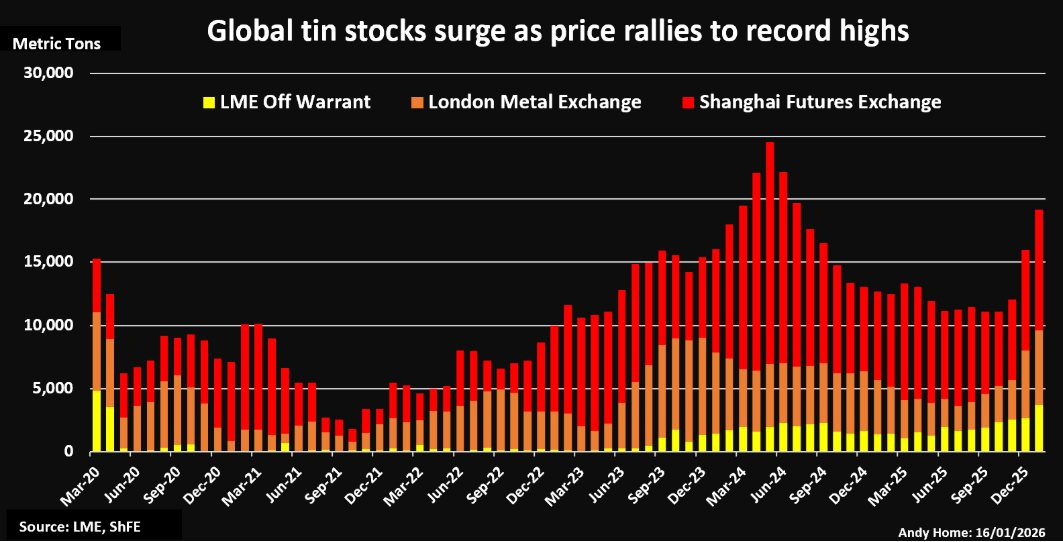 Nguồn cung thiếc tinh luyện hiện cũng không hề khan hiếm. Các nhà sản xuất và thương nhân đã đưa lượng lớn kim loại ra thị trường trong đợt tăng giá. Tổng tồn kho trên LME và ShFE đã tăng từ 11.000 tấn cuối tháng 10 lên hơn 19.000 tấn. Tại đỉnh giá năm 2022, tồn kho chỉ dưới 5.000 tấn.