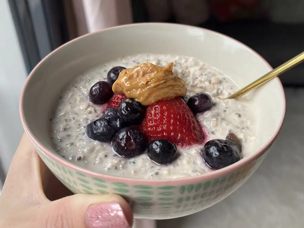 Công thức bữa sáng gắn bó lâu dài với Rachel là overnight oats – yến mạch ngâm qua đêm. Món ăn này có cách chuẩn bị vô cùng đơn giản, chỉ mất vài phút vào buổi tối nhưng lại mang đến bữa sáng tiện lợi, đầy đủ dinh dưỡng cho sáng hôm sau. Thành phần chính gồm yến mạch cán dẹt, sữa chua Hy Lạp, kefir, hạt chia, trái cây tươi và đôi khi bổ sung thêm bột protein. Sự kết hợp này tạo nên một bữa ăn cân bằng giữa carbohydrate hấp thu chậm, protein chất lượng cao, chất béo lành mạnh và chất xơ.