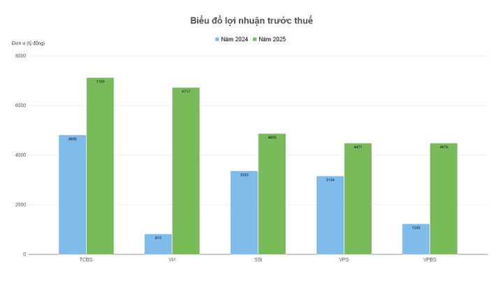 Ba cái tên khác có lợi nhuận cao trong năm 2025 là Chứng khoán SSI, VPS, VPBank Securities. Trong đó, SSI có lợi nhuận trước thuế năm 2025 đạt gần 4.860 tỷ đồng, tăng 45% so với cùng kỳ năm trước.