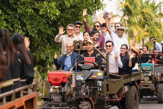 Bà Urawadee Sriphiromya - Đại sứ Vương quốc Thái Lan tại Việt Nam, Bà Camila Polo Florez - Đại sứ Colombia tại Việt Nam, Ông Saadi Salama – Đại sứ Palestine tại Việt Nam (ở giữa từ trái qua) thích thú trải nghiệm văn hóa cà phê bản địa tại rẫy cà phê ở Buôn Tơng Jú, Đắk Lắk trong khuôn khổ Diễn đàn.
