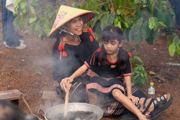 Với anh Y Jel, 39 tuổi, người Ê Đê ở Buôn Tơng Ju, cà phê là một phần quen thuộc trong đời sống hằng ngày. Gia đình anh vẫn giữ cách uống cà phê đơn giản, chân chất như thời ông bà: hái những quả cà phê đỏ mọng hoặc chín rụng, phơi khô, rang, xay rồi uống cùng mật mía. Sau bữa tối, bà con trong buôn thường tụ họp, cùng hát, đọc kinh, trò chuyện và chia nhau những ly cà phê ấm. Cà phê đi cùng nhịp sinh hoạt ấy và cũng là nguồn thu nhập chính của nhiều gia đình qua từng mùa vụ. Hai lớp giá trị này đan vào nhau, hình thành một đời sống gắn bó chặt chẽ với cây cà phê.