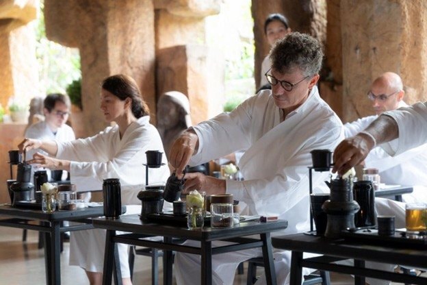 Ông Jonathan Baker – Trưởng đại diện UNESCO tại Việt Nam và bà Camila Polo Florez, Đại sứ Colombia tại Việt Nam (từ phải qua trái) trải nghiệm “Thiền Cà phê” tại Làng Cà phê (Buôn Ma Thuột).