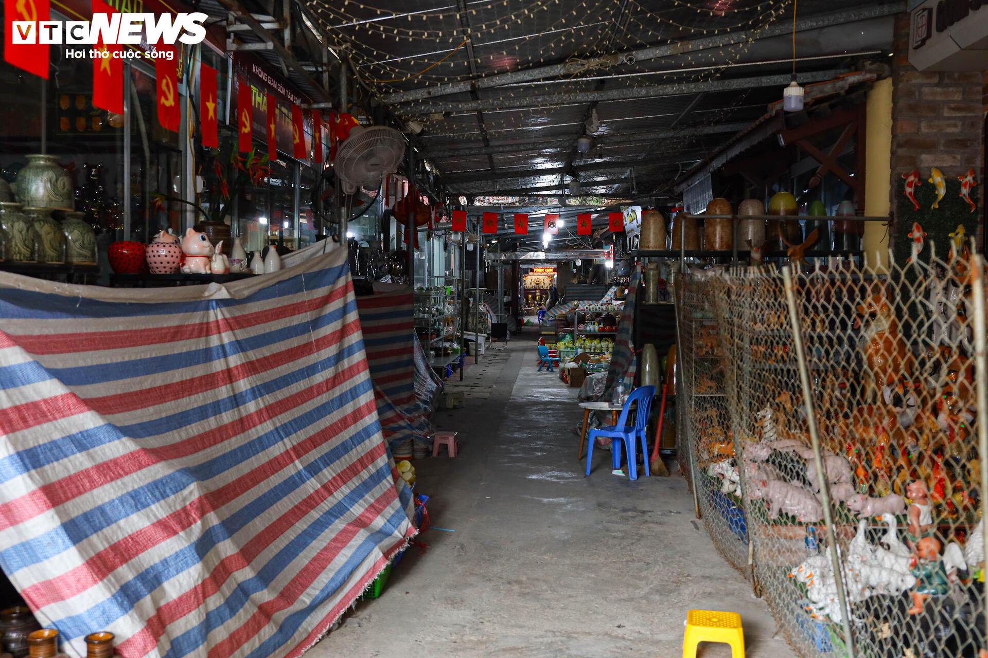 Hình ảnh bên trong của khu chợ gốm ngày 4/6, nhiều cửa hàng đã đồng loạt phủ bạt, giăng lưới khóa cửa. Được biết, những quầy hàng này đóng cửa 4,5 ngày nay vì không có khách mua. Thời tiết nắng nóng nên nếu mở cửa sẽ tốn tiền điện, tiền thuê nhân viên càng khiến tiểu thương không mặn mà buôn bán.