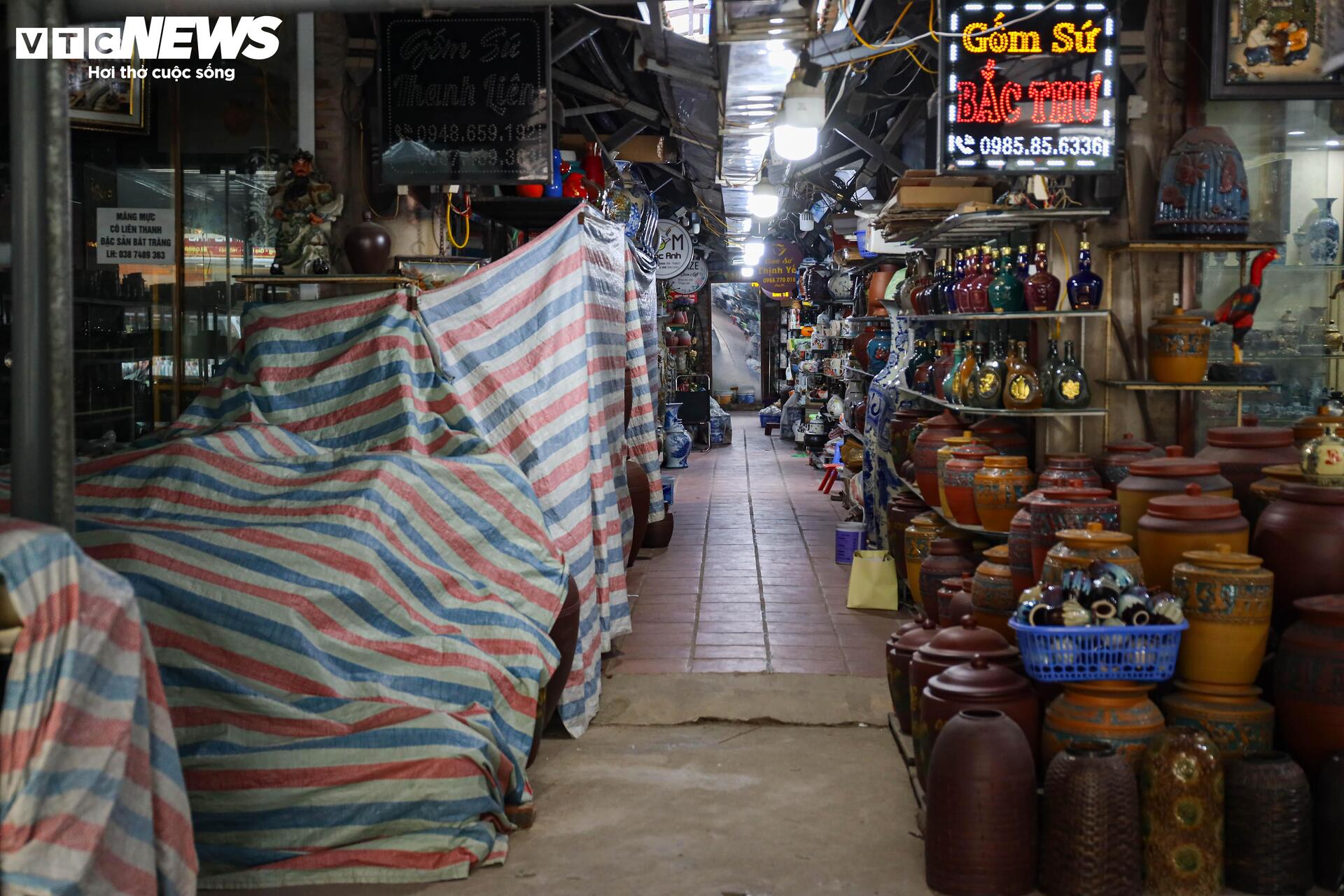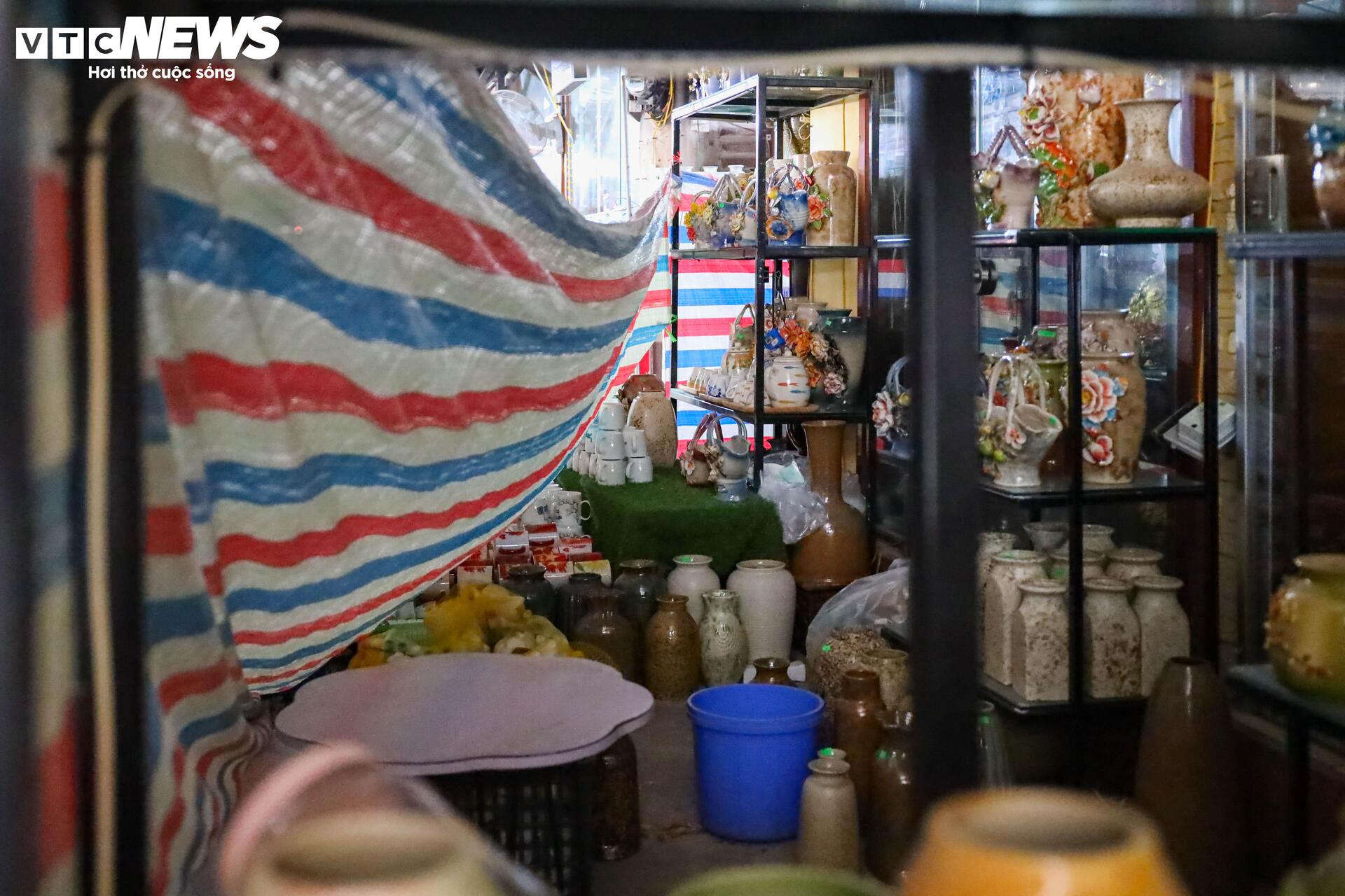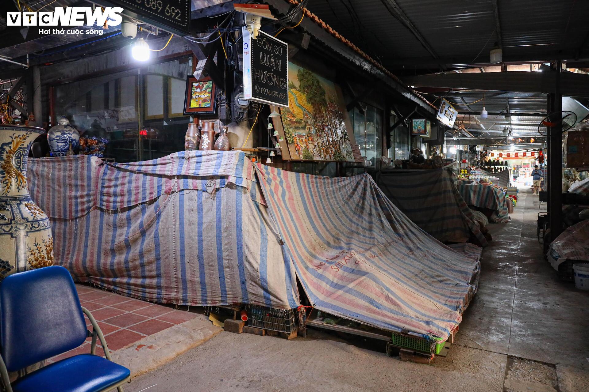 Phía sau những lớp bạt phủ là các sản phẩm gốm sứ bị xếp gọn lại. Có lẽ những sản phẩm này đã rất lâu rồi không bán được.