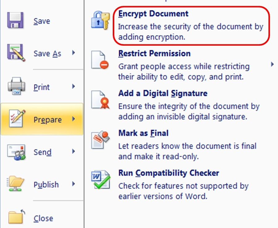 - Gửi thành file Word hoặc PDF có mật khẩu (chọn tính năng Encrypt with password (Mã hóa bằng mật khẩu) để bảo mật cao hơn - người dùng nên tự tìm trong Word vì các phiên bản khác nhau có thể hơi khác nhau), rồi gửi mật khẩu đó cho người nhận trong một tin nhắn khác (thậm chí qua một ứng dụng khác); hoặc gọi điện nói mật khẩu cho người nhận.