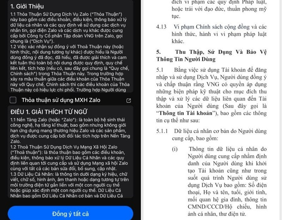 Nhưng trong vài ngày qua, nhiều người dùng đã hoang mang và thậm chí lo lắng vì những điều khoản mới cập nhật của Zalo, trong đó có mục được hiểu là Zalo có quyền thu thập, chia sẻ, lưu trữ dữ liệu cá nhân của người dùng. Mà nếu người dùng không đồng ý thì tài khoản sẽ bị khóa, theo Tiền Phong . Những điều này rõ ràng khiến bất kỳ ai cũng lo ngại về việc xử lý và kiểm soát dữ liệu cá nhân của mình.