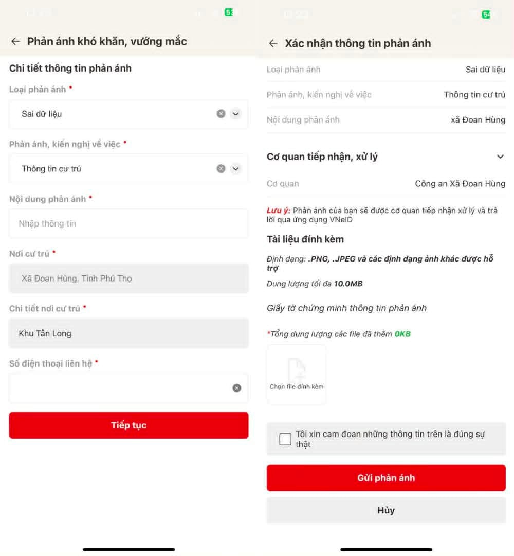 Bước 5: VNeID sẽ cho người dùng kiểm tra lại thông tin mình đã phản ánh xem có chính xác hay chưa. Nếu các thông tin khai báo đã chính xác, người dùng hãy đánh dấu vào tùy chọn “Tôi xin cam đoan những thông tin trên là đúng sự thật” và nhấn nút “Gửi phản ánh”.