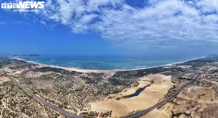 Toàn cảnh vùng biển hoang sơ kéo dài từ Trung Lương (xã Cát Tiến) đến cảng cá Đề Gi (xã Đề Gi) từ trên cao.