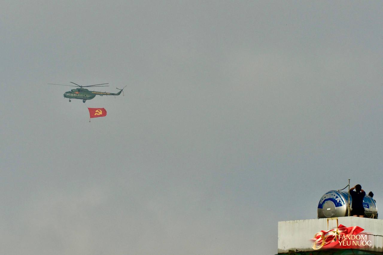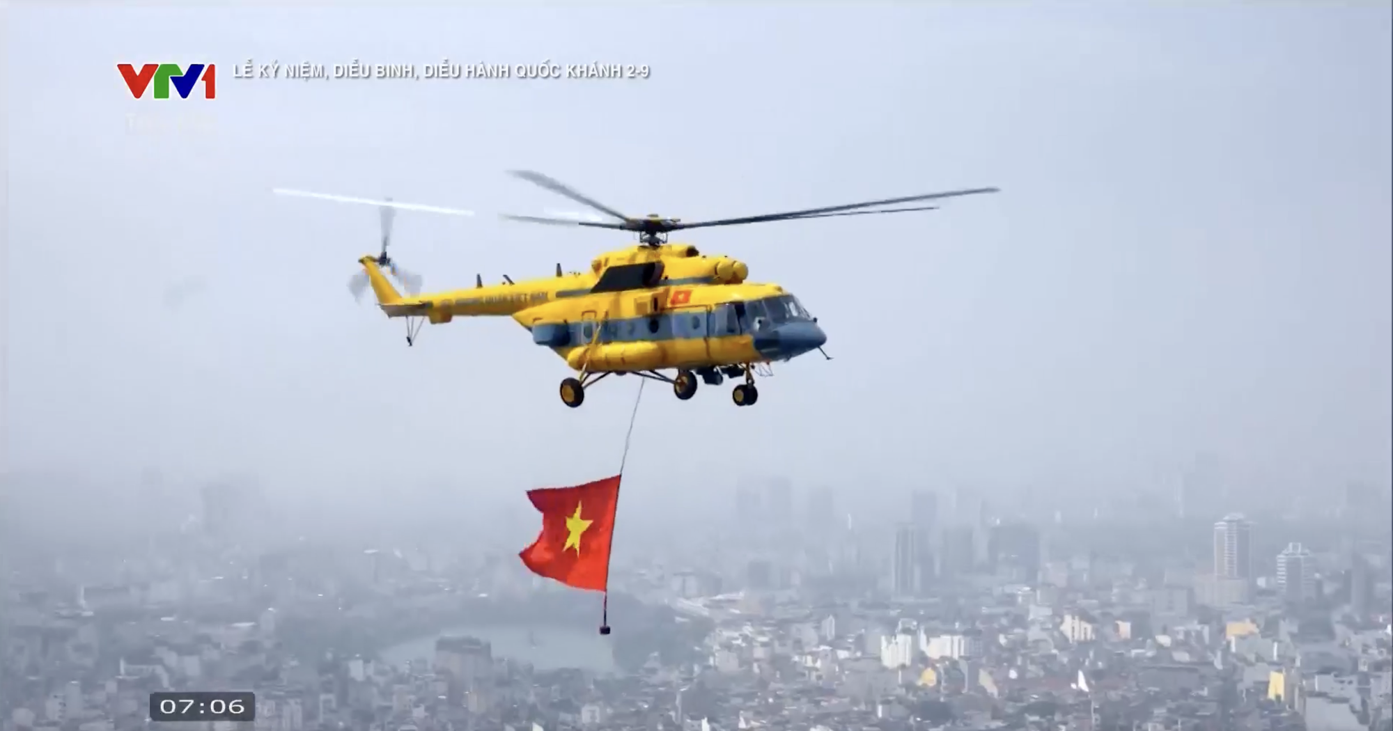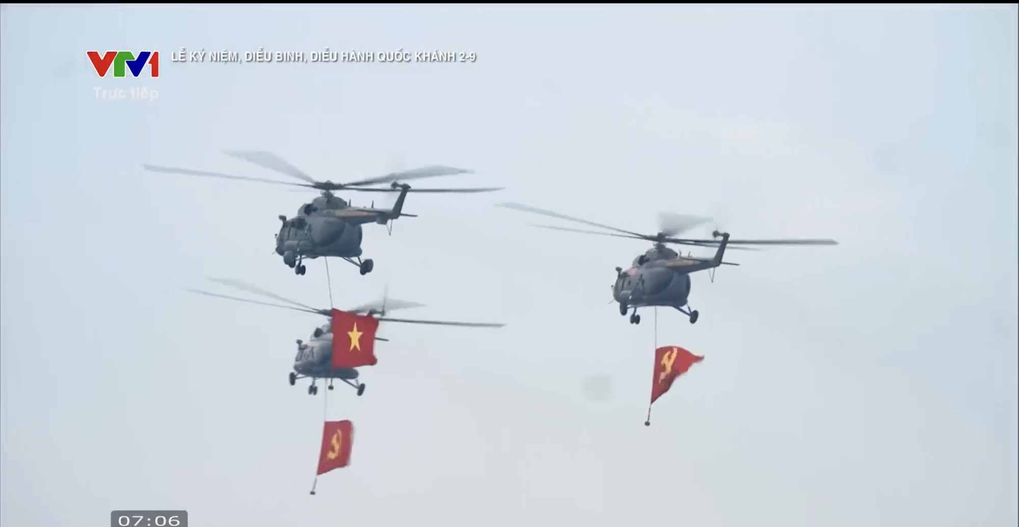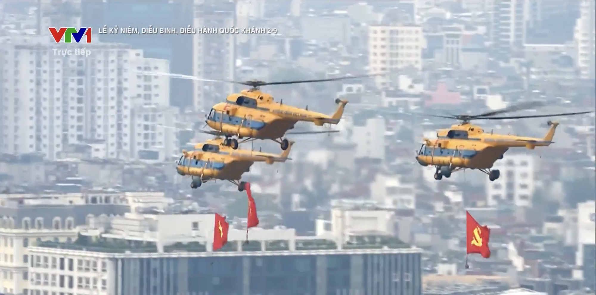 Dẫn đầu là biên đội trực thăng Mi-171, Mi-17, Mi-8, mang cờ Đảng, cờ Tổ quốc tung bay trên Quảng trường Ba Đình lịch sử. Biểu tượng cho sức mạnh đại đoàn kết, niềm tự hào của Đảng và dân tộc, thể hiện bản lĩnh, trí tuệ, khát vọng xây dựng đất nước cất cánh, vươn cao trong kỷ nguyên mới.