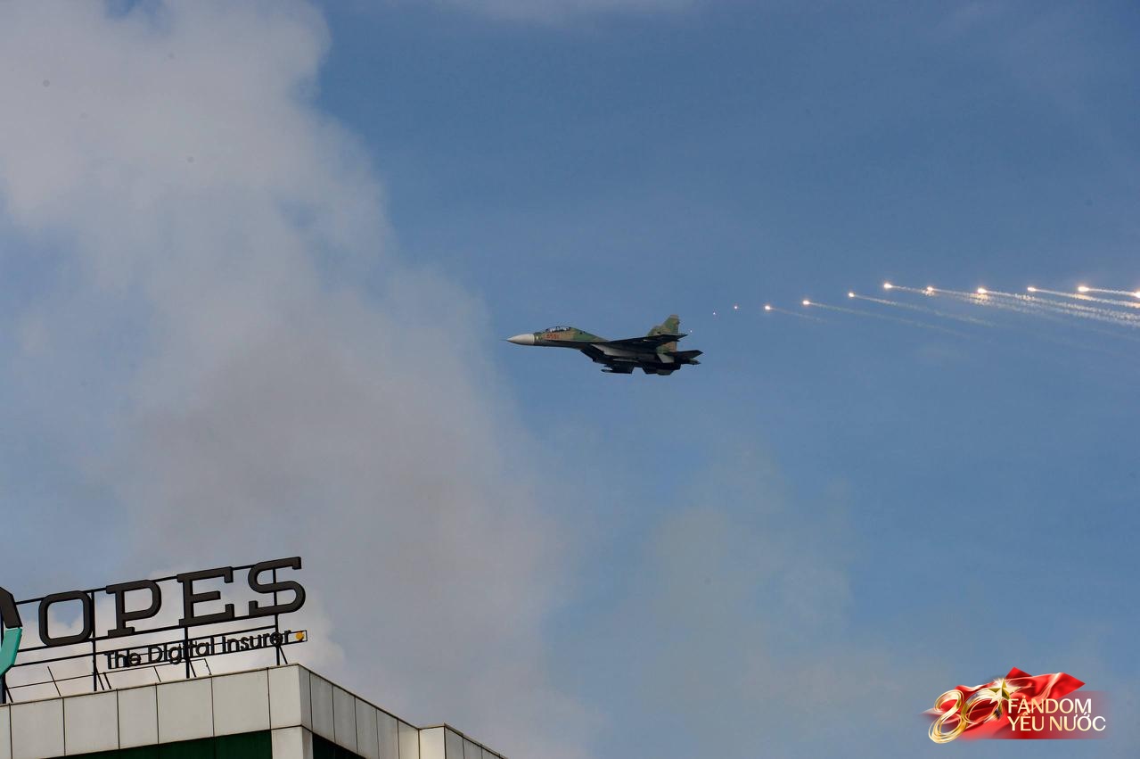 Đặc biệt, ở lượt thông qua trung tâm Quảng trường Ba Đình lần thứ 2, đội hình Yak-130 và SU-30MK2 trình diễn màn thả bẫy nhiệt rực sáng giữa bầu trời Thủ đô.