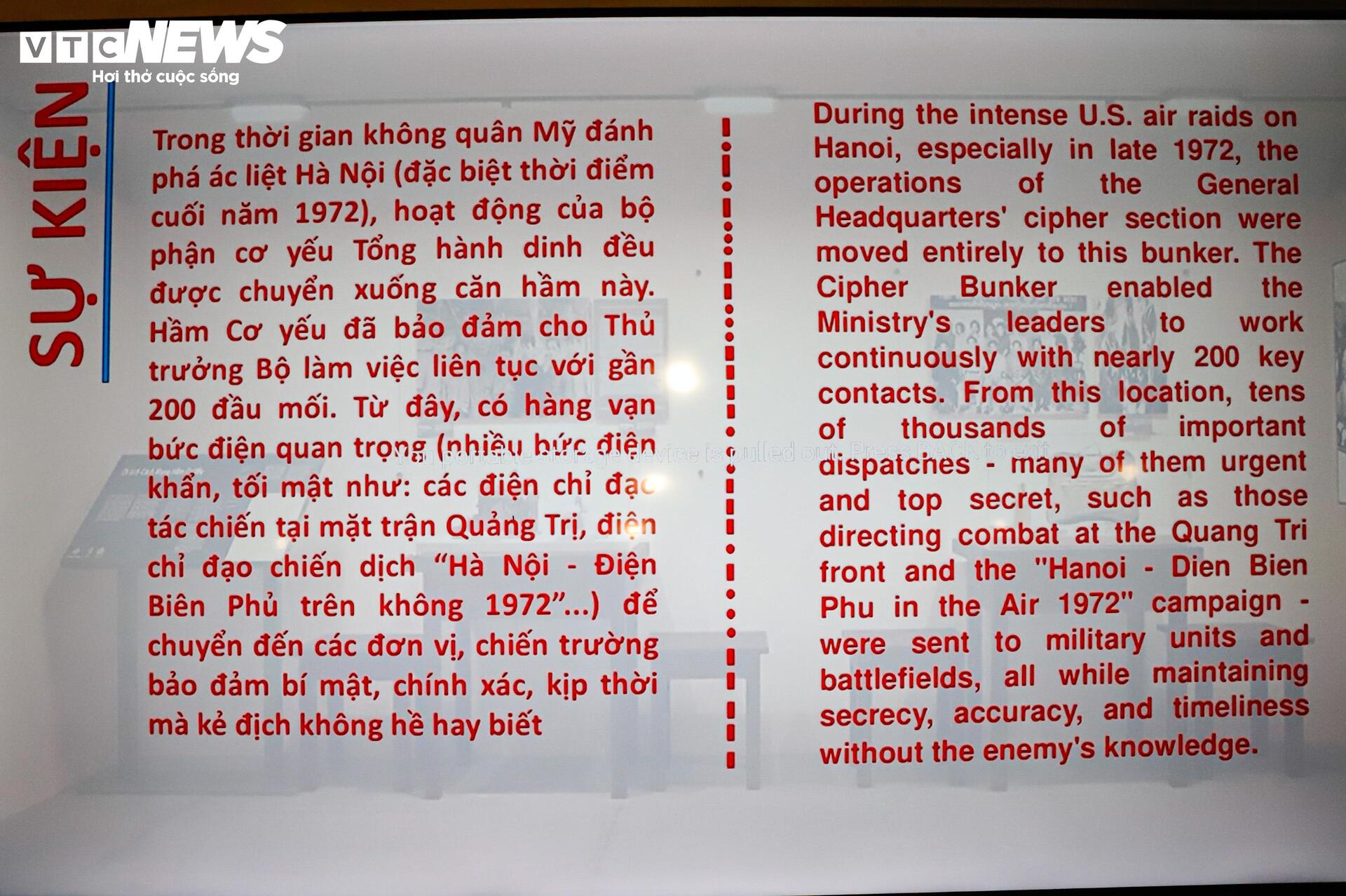 Đặc biệt, các thông tin trưng bày sẽ được diễn giải bằng phim tài liệu, hệ thống pano trong hầm và bên ngoài hầm, sử dụng âm thanh kể chuyện tạo cho khách tham quan cảm nhận như đang hoà mình vào không gian làm việc tại Hầm Cơ yếu trong thời điểm lịch sử đó.