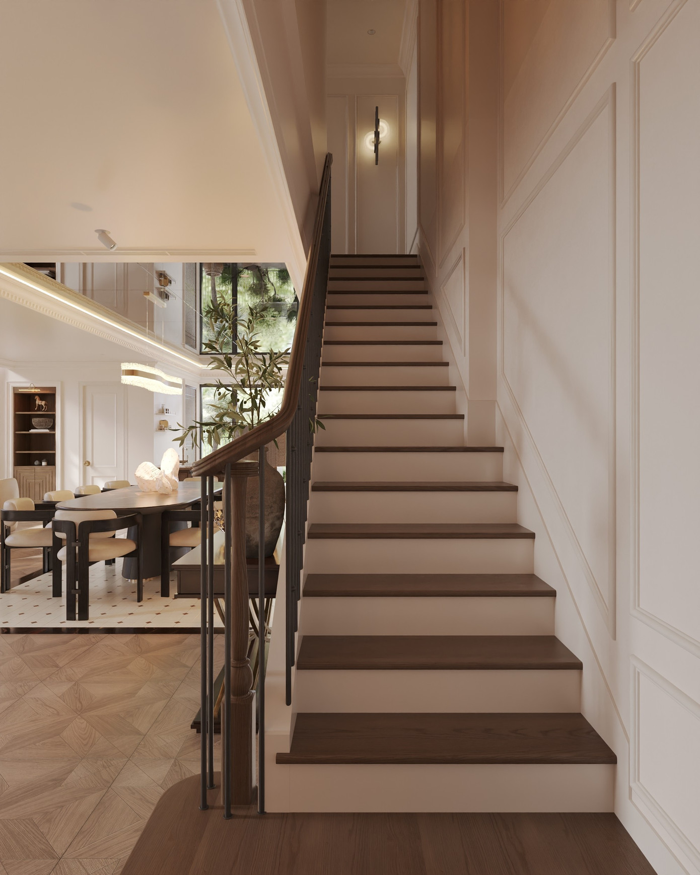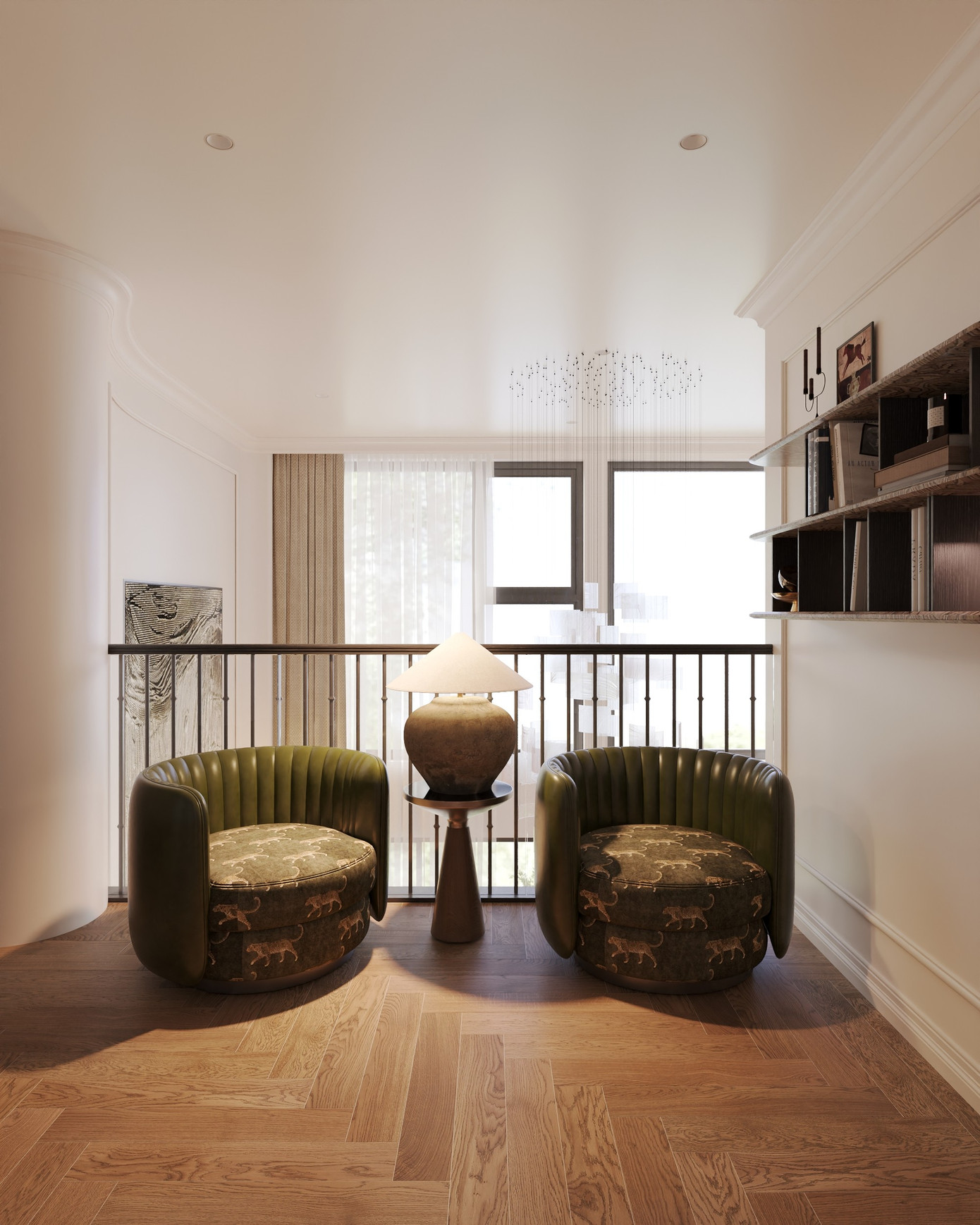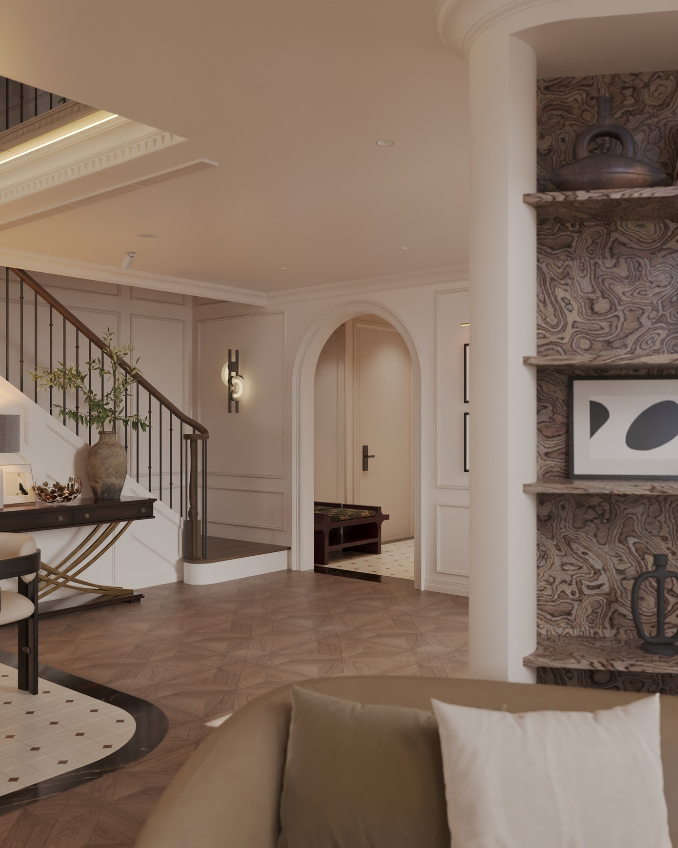 Phong cách chủ đạo của căn hộ là Transitional với không gian tầng 1 sang trọng, tinh tế, tầng 2 thân thiện ấm cúng.
