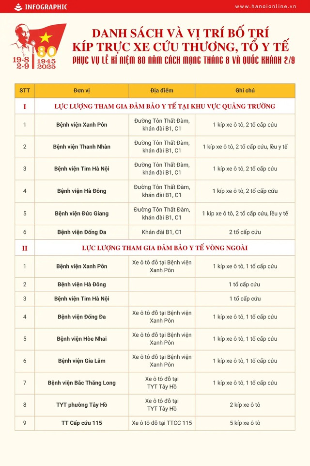 Khi các sự kiện diễu binh, diễu hành và các hoạt động kỷ niệm 80 năm Cách mạng Tháng Tám diễn ra tại Hà Nội, nhiều khu vực trọng điểm sẽ có các điểm hỗ trợ y tế, trạm cấp cứu và xe cứu thương túc trực.