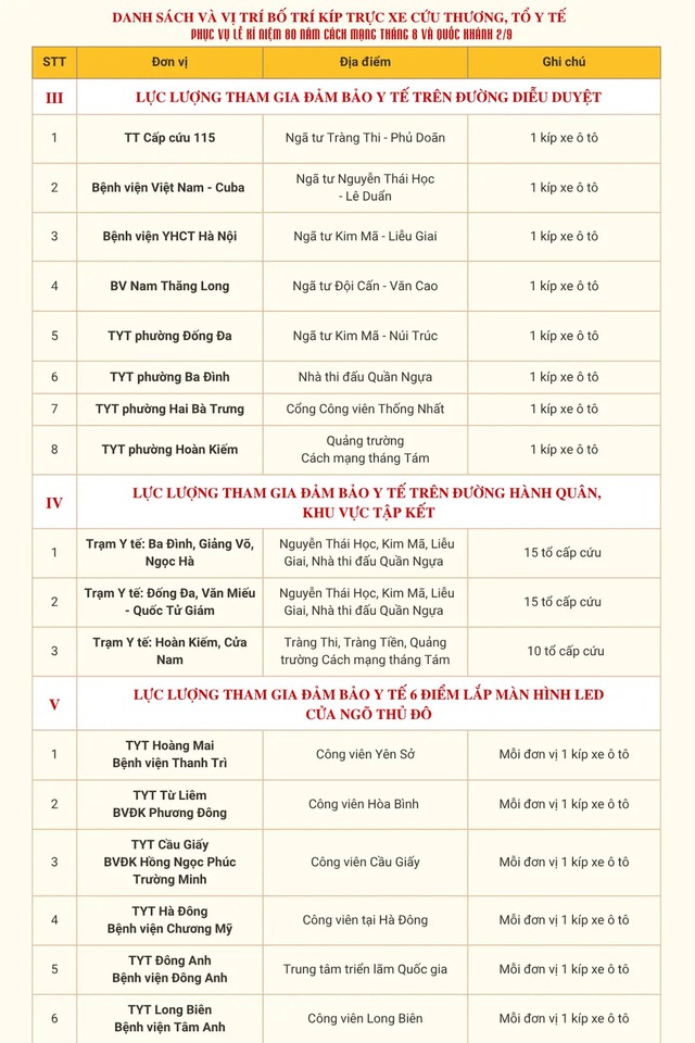 - Lều cứu hộ và xe cứu thương sẽ được bố trí tại những điểm có đông người tham gia như Quảng trường Ba Đình, Nhà hát Lớn, và Mỹ Đình.