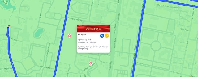 Khi bấm vào nút dấu hình chữ thập bất kỳ ta sẽ nhận được thông tin của Điểm hỗ trợ y tế nằm trên đường phố và khu vực cụ thể nào.