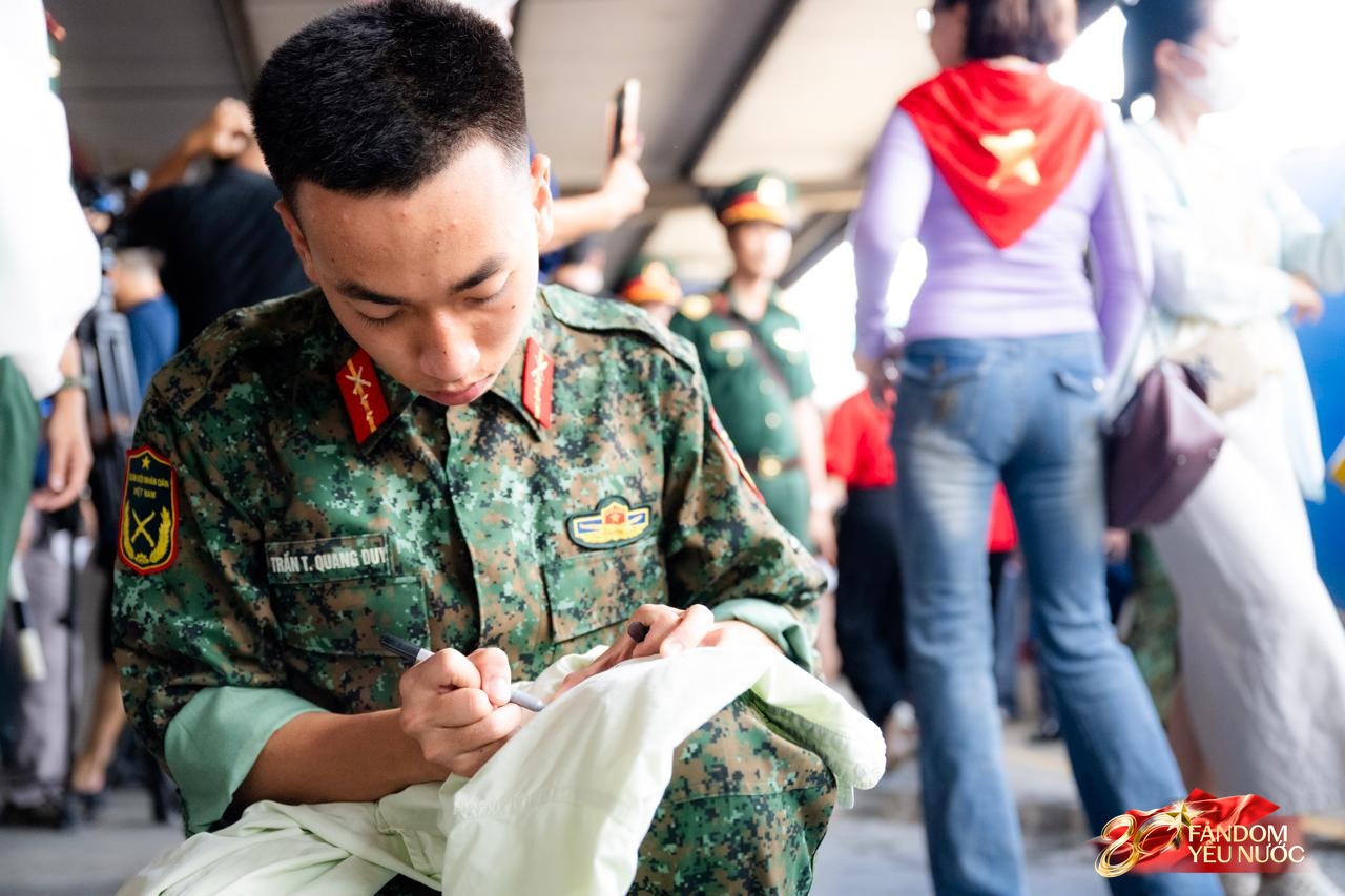 Trên sân ga, nhiều chiến sĩ vui vẻ ký tặng lên áo, lên sổ tay của người dân, để lại kỷ niệm giản dị mà đáng nhớ, như muốn lưu giữ tình quân dân trong từng nét bút.