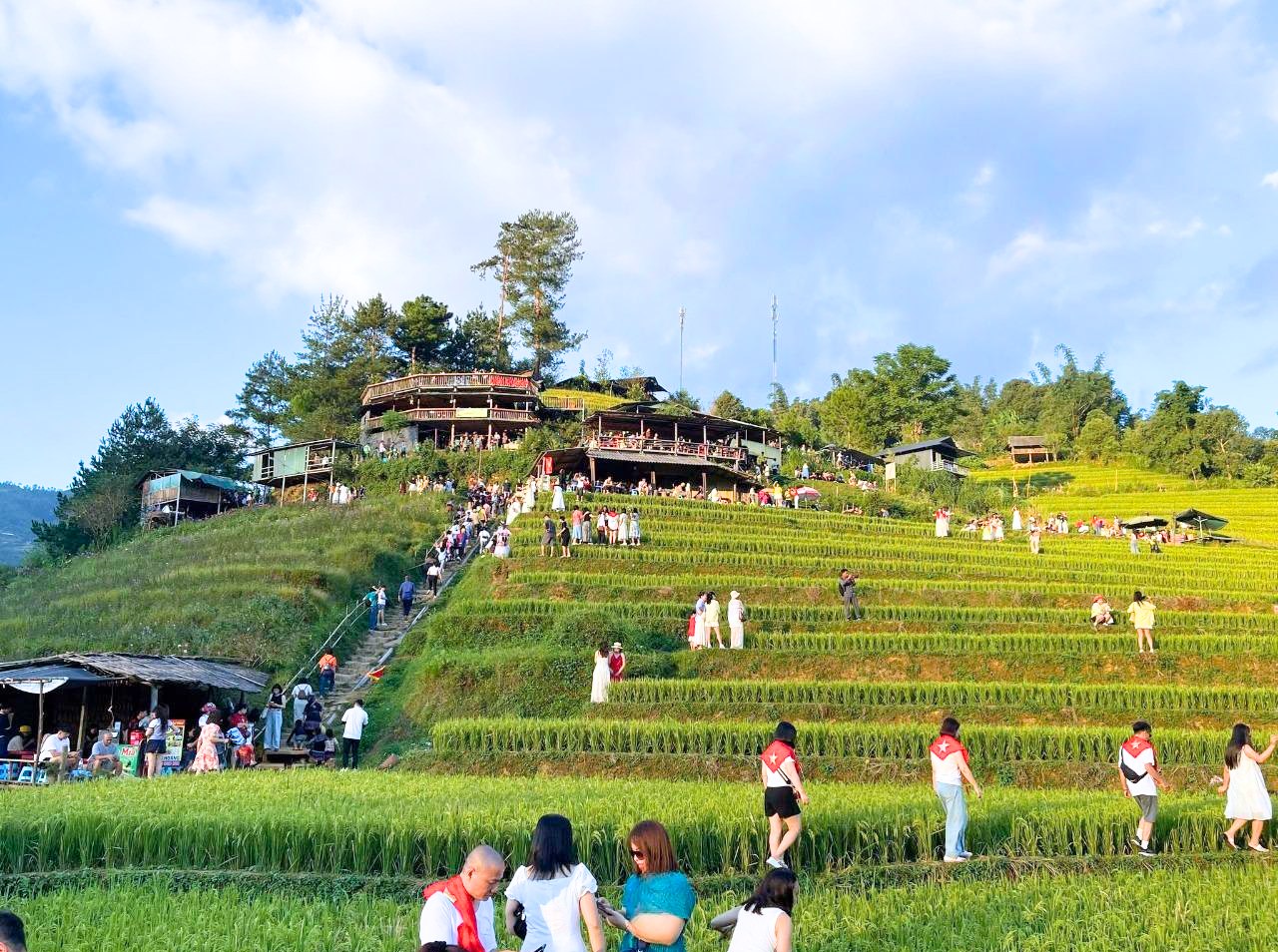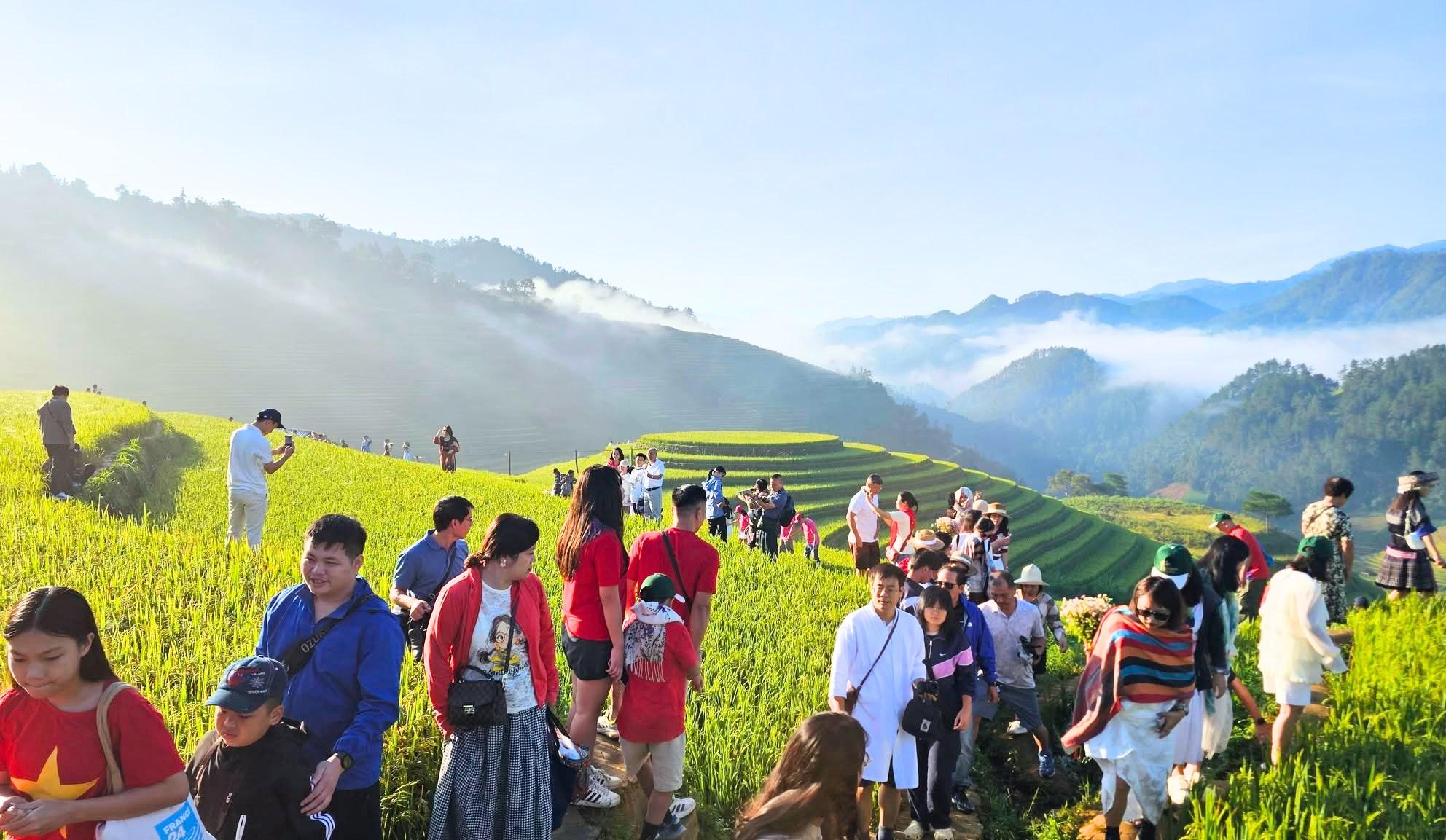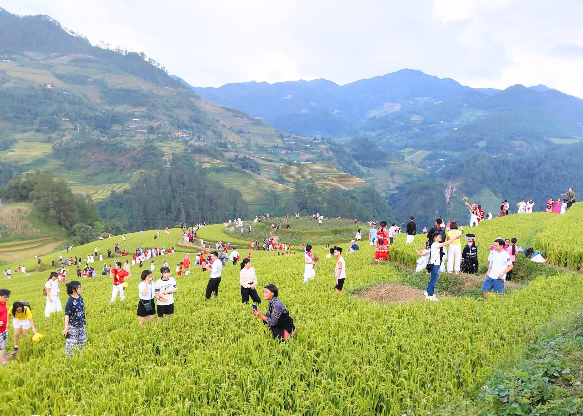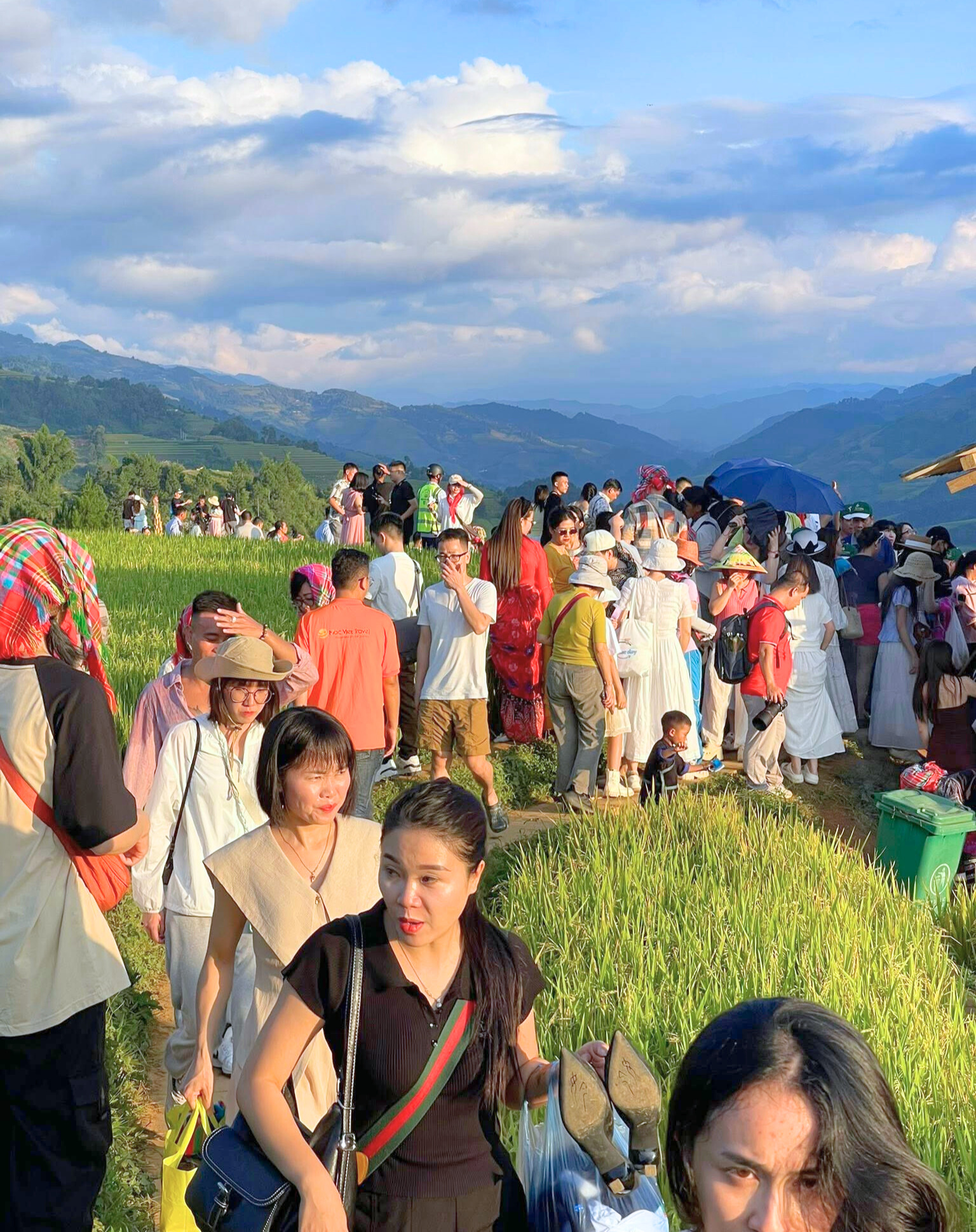 Trên các lối mòn dẫn vào đồi Móng Ngựa, Mâm Xôi lớn, Mâm Xôi nhỏ, dòng người ken đặc, chen nhau từng bước để tìm chỗ ngắm cảnh, chụp ảnh "sống ảo". Những góc ruộng chín sớm trở thành điểm check-in được săn lùng, nơi từng tốp bạn trẻ, cặp đôi hay cả gia đình xếp hàng tạo dáng, lưu lại khoảnh khắc giữa "mùa vàng" Tây Bắc.