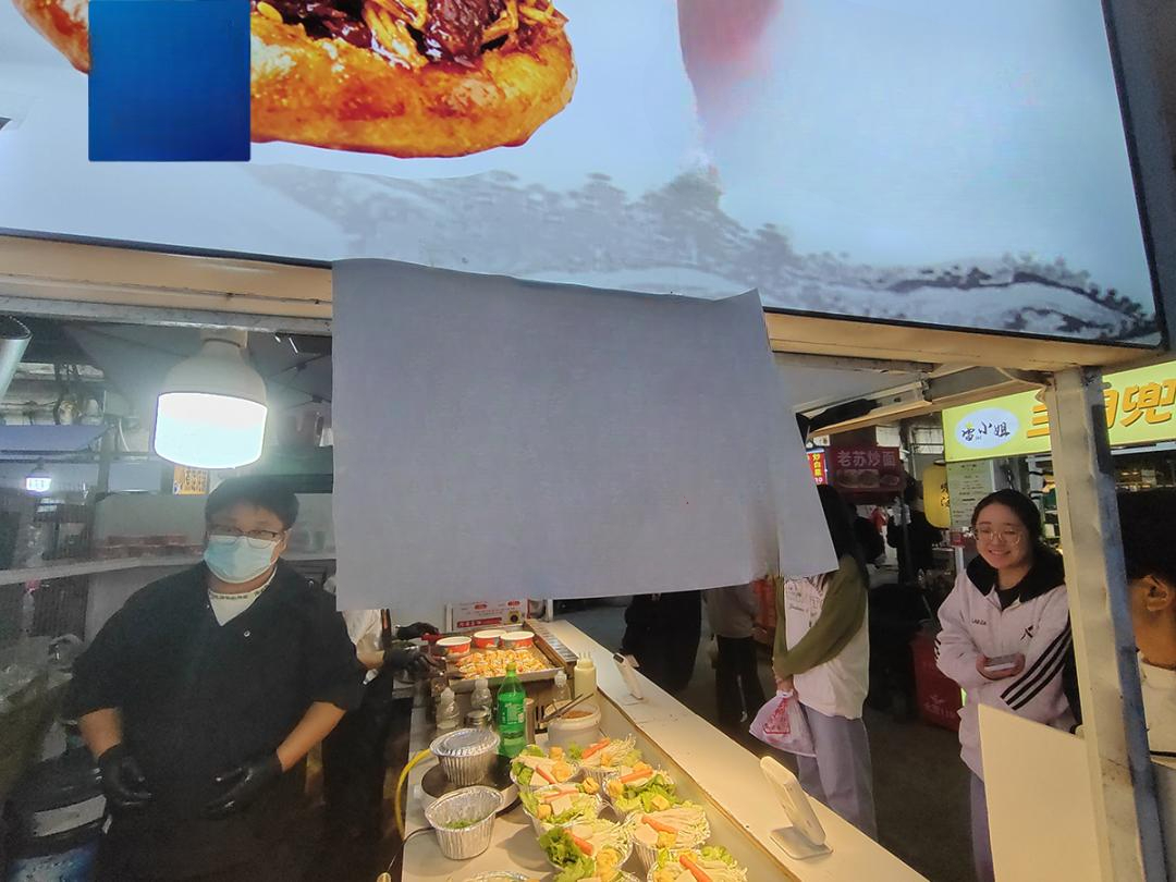Bên ngoài cổng phía tây khu học xá của Đại học Sư phạm Phúc Kiến, có một con phố ăn vặt vốn quen thuộc với sinh viên và người dân địa phương. Mỗi chiều tối, khi đèn đường bật sáng, nơi đây lại rộn ràng mùi thơm của hoành thánh, bánh xèo, trà thảo dược, bánh trứng… tạo nên nhịp sống sôi động.