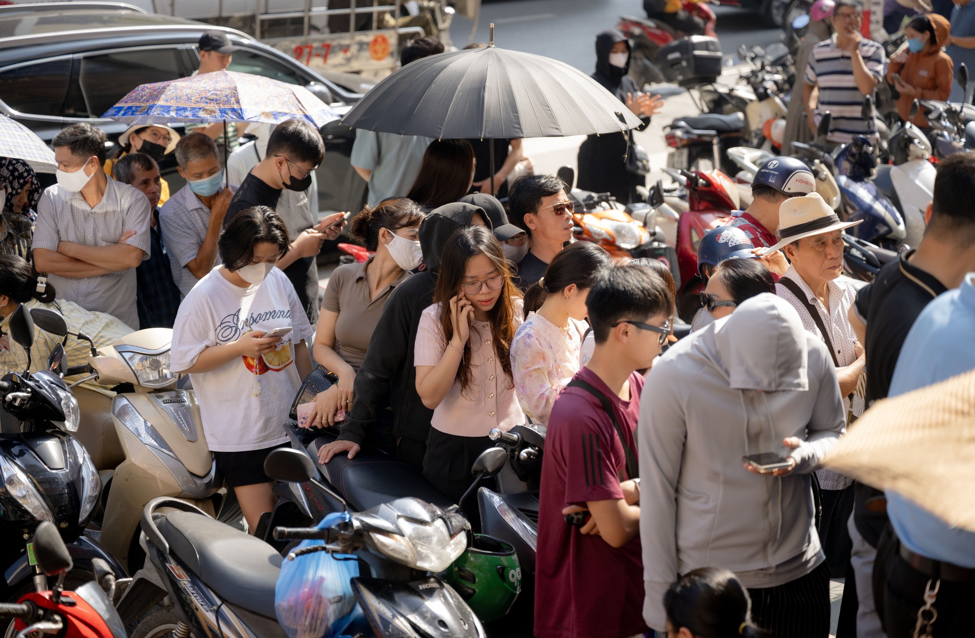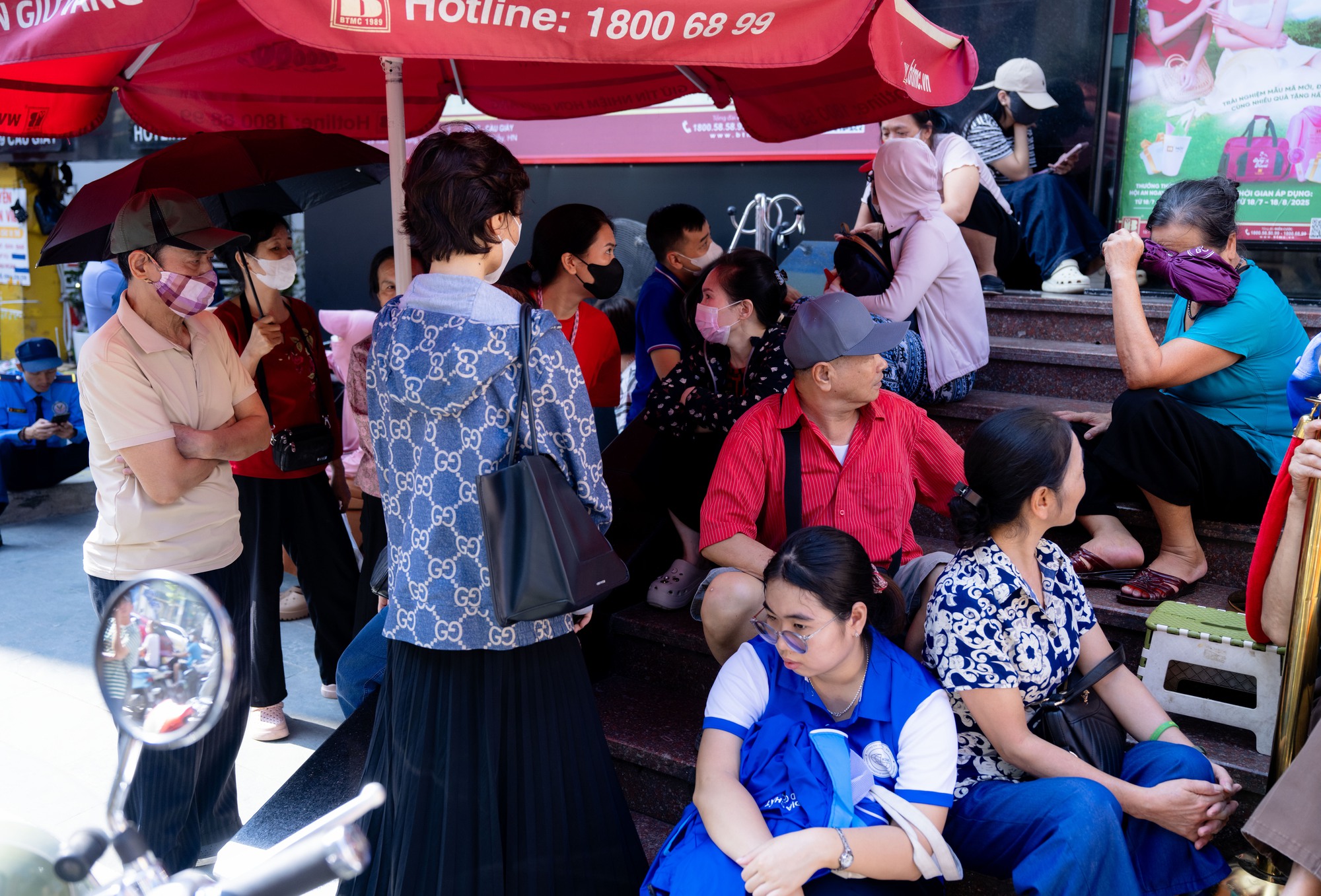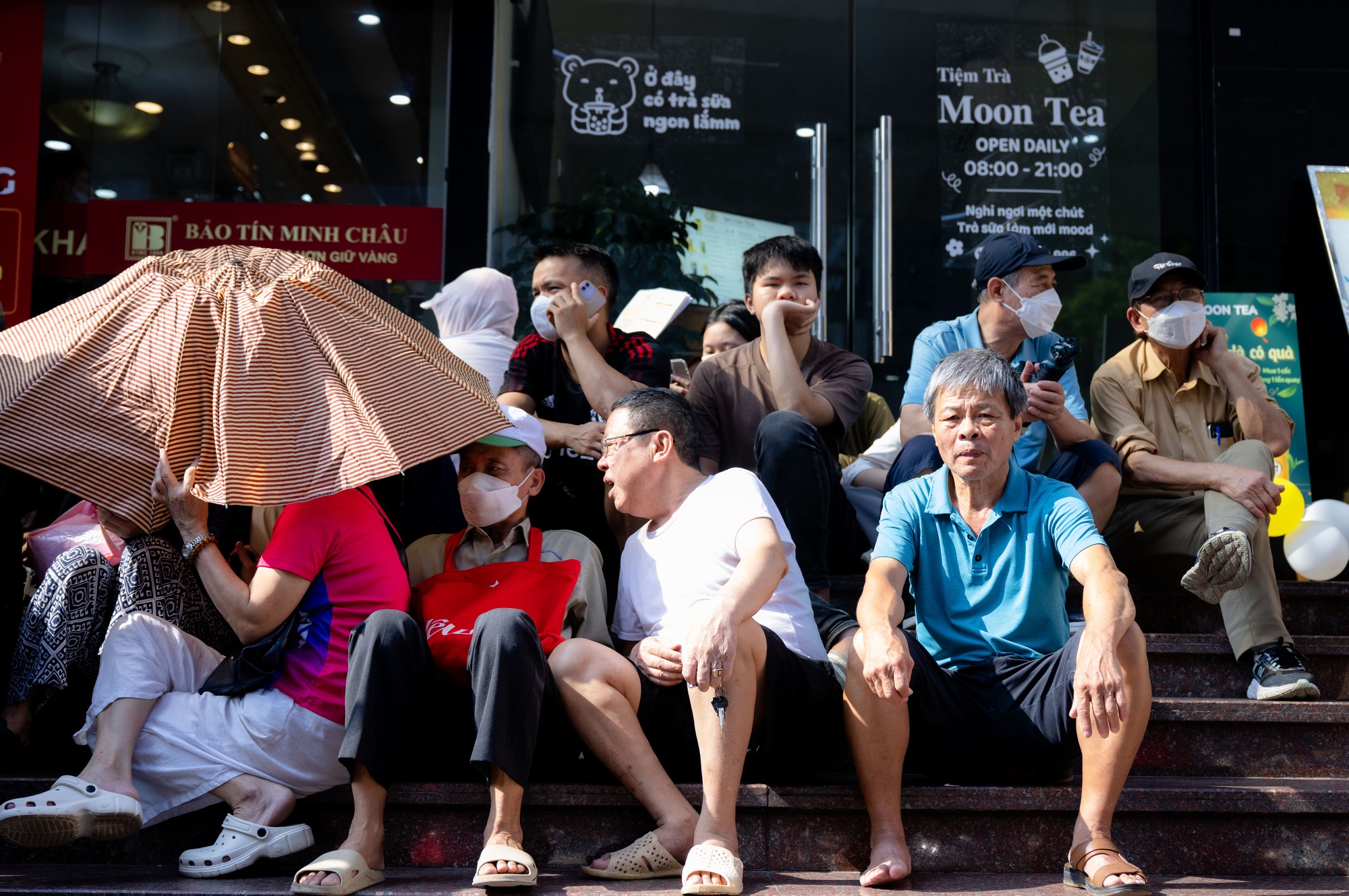 Thời tiết nắng nóng, nhiều người chen chân bên trong chiếc ô che trước cửa hàng để chờ đợi