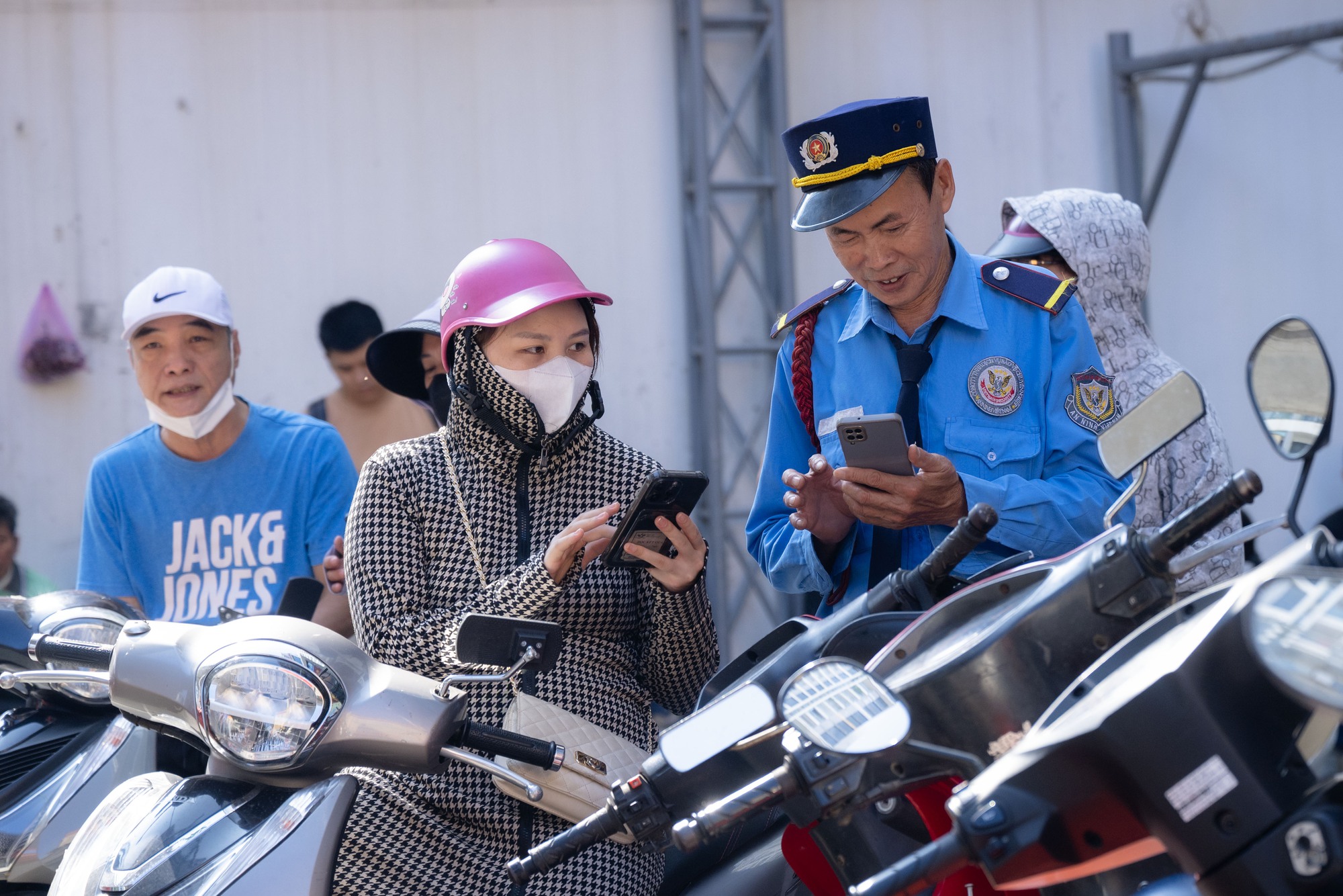 Bảo vệ tại cửa hàng vàng cũng tất bật hướng dẫn người dân để xe đúng vị trí, các thức lấy số thứ tự, xếp hàng sao cho trật tự