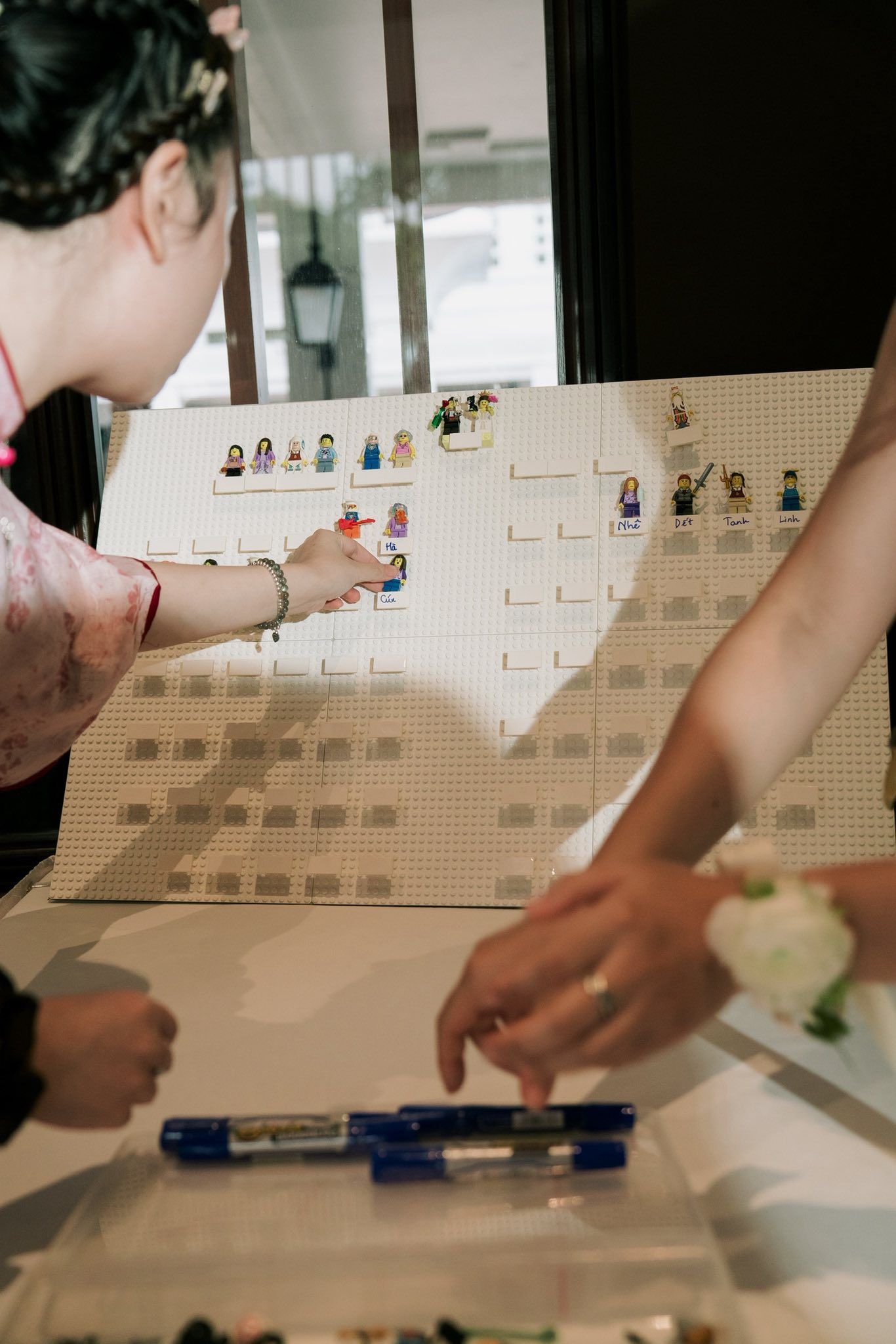 Chuyện gì đến cũng phải đến. Được sự đồng ý của vợ và gia đình, mình có thêm thắt 1 chút Lego vào trang phục và tiệc cưới, trong đó có bội áo dài và hộp nhẫn mình tự ghép và khá tâm đắc. Mình cũng học lỏm đám cưới nước ngoài và thiết kế Lego guest list cùng với lễ cất nóc nhà Lego, và thậm chí cho vào lời vows của mình nữa".