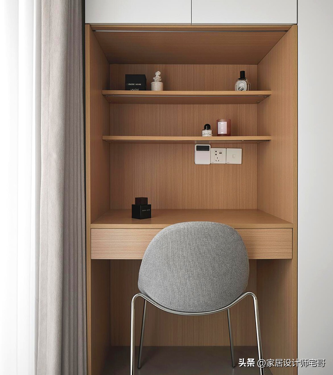 Phòng ngủ sử dụng tủ quần áo cao sát trần để tăng không gian lưu trữ. Việc tích hợp khu trang điểm và làm việc ngay trong phòng ngủ giúp tận dụng từng mét vuông hiệu quả.