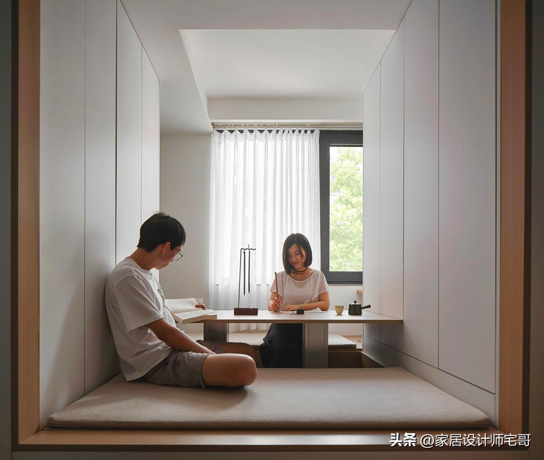 Ban công cũ được cải tạo thành khu tatami đa năng, có thể dùng làm góc đọc sách, làm việc hoặc phòng ngủ phụ khi cần. Bàn nâng linh hoạt giúp thay đổi công năng nhanh chóng, phù hợp với nhu cầu sống linh hoạt của người trẻ.