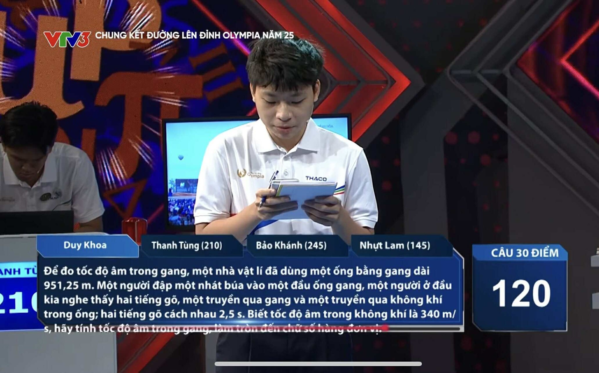 Sau thời gian suy nghĩ, Duy Khoa đưa ra đáp án 3.194,3 m/s nhưng đáp án không được chấp nhận. Sau đó MC mời các thí sinh còn lại bấm chuông. Bảo Khánh là người nhanh tay nhất và chọn đáp án 180 m/s, tuy nhiên đây không phải là câu trả lời chính xác.