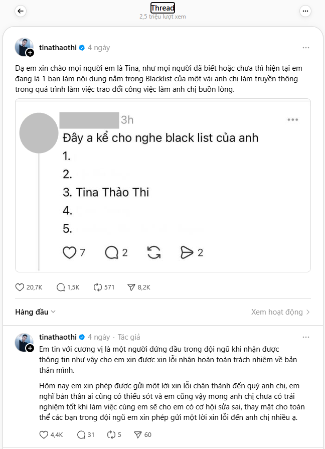 Tuy nhiên đến thời điểm hiện tại - 4 ngày kể từ khi nổ ra ồn ào, bài đăng của Tina Thảo Thi vẫn đang viral với 2,5 triệu lượt xem trên Threads nhưng Tina chưa có cập nhật chính thức nào khác về vụ blacklist.