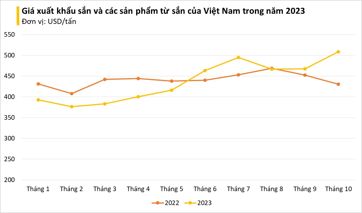 Trong tháng 10/2023, giá sắn và các sản phẩm từ sắn xuất khẩu tăng mạnh lên mức cao nhất kể từ đầu năm 2023 đến nay. Cụ thể, giá bình quân xuất khẩu sắn và các sản phẩm từ sắn ở mức 508,6 USD/tấn, tăng 8,8% so với tháng 9/2023 và tăng 18,1% so với tháng 10/2022.