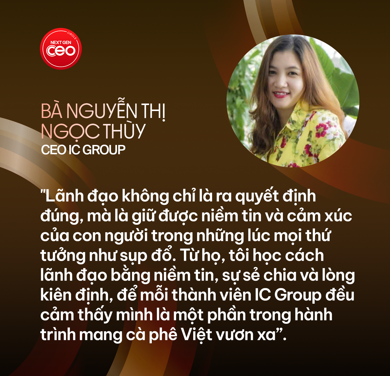 Từ họ, tôi học cách lãnh đạo bằng niềm tin, sự sẻ chia và lòng kiên định, để mỗi thành viên IC Group đều cảm thấy mình là một phần trong hành trình mang cà phê Việt vươn xa”, CEO Nguyễn Thị Ngọc Thùy nói.