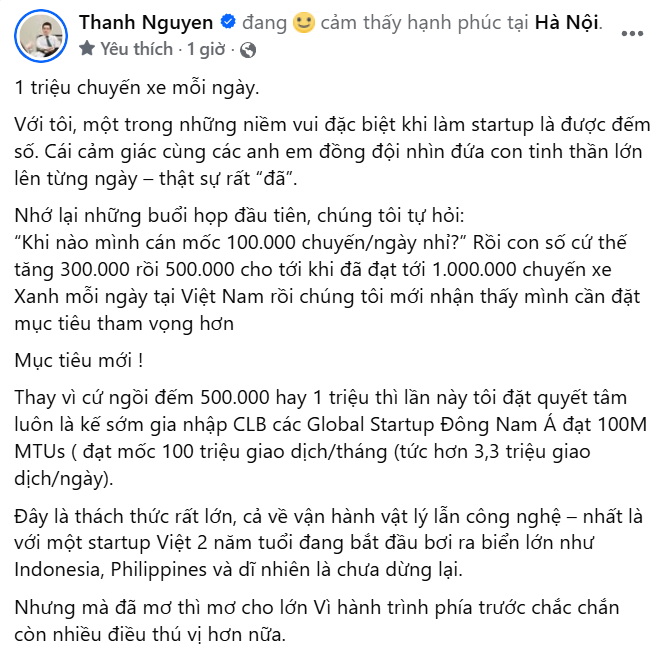 Trên trang cá nhân mới đây, CEO Nguyễn Văn Thanh chia sẻ rằng, đội ngũ từng đặt mục tiêu khiêm tốn “bao giờ mới đạt 100.000 chuyến/ngày?”, nhưng chỉ sau vài tuần, con số này đã nhanh chóng tăng lên 300.000, rồi 500.000. Và rồi, chưa đầy hai năm đã đạt đến 1 triệu chuyến/ngày – tương đương trên 11 chuyến mỗi giây, phản ánh sức tăng trưởng mạnh mẽ của thương hiệu taxi điện Việt Nam.