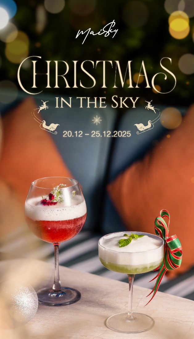 Nếu muốn đổi gió, Mai Sky Rooftop Bar là nơi Giáng Sinh chạm vào bầu trời thành phố. Từ trên cao, Sài Gòn hiện ra lấp lánh ánh đèn, trong khi trên tay là ly cocktail “Christmas in the Sky” được pha chế riêng cho mùa lễ hội.