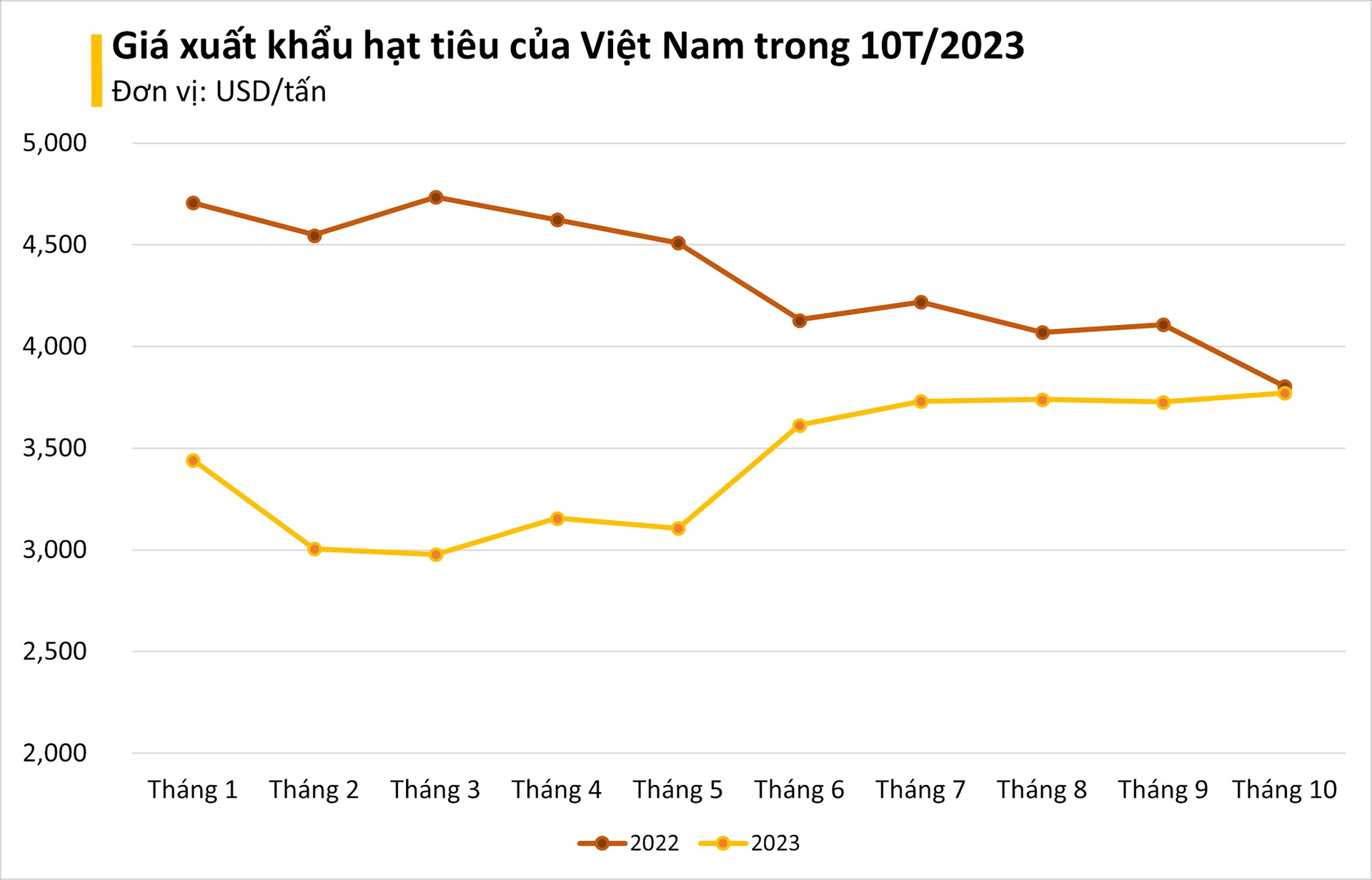 So với cùng kỳ năm ngoái lượng xuất khẩu hồ tiêu tăng 14,6%, tuy nhiên kim ngạch xuất khẩu lại giảm 11,7%. Giá xuất khẩu bình quân tiêu đen 10 tháng năm 2023 đạt 3.553 USD/tấn, tiêu trắng đạt 5.082 USD/tấn, so với cùng kỳ năm trước, giá xuất khẩu tiêu đen giảm 17,6% đối với tiêu đen và 15,6% đối với tiêu trắng.