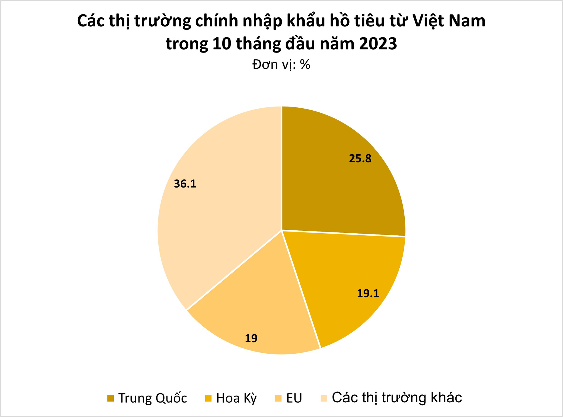 10 tháng đầu năm 2023, Trung Quốc vẫn là thị trường xuất khẩu hồ tiêu lớn nhất của Việt Nam đạt 57.723 tấn, chiếm 25,8% thị phần và tăng 265,3% so cùng kỳ, tuy nhiên lượng nhập khẩu những tháng gần đây của Trung Quốc đang có chiều hướng giảm sau khi đã mua đủ lượng hàng từ 2 quý đầu năm.