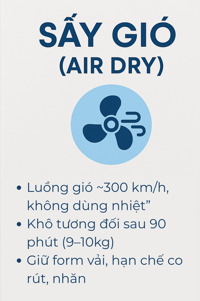 Cách sử dụng chế độ này cũng rất đơn giản. Sau khi chu trình giặt – xả – vắt hoàn tất, người dùng chỉ cần chọn nút "Sấy gió" hoặc "Sấy gió 90 phút" tùy theo từng dòng máy, sau đó ấn khởi động. Khi máy phát ra tín hiệu báo kết thúc, quần áo đã được làm khô ở mức tương đối. Chỉ cần phơi thêm vài giờ trong không khí tự nhiên là trang phục có thể khô hoàn toàn, bất chấp thời tiết mưa phùn, nồm ẩm.