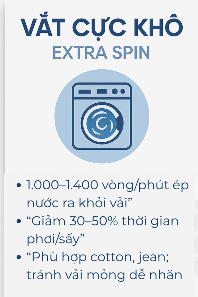 Bên cạnh chế độ sấy gió, một tính năng khác trên máy giặt hiện đại cũng được nhiều chuyên gia khuyến khích sử dụng trong mùa mưa ẩm là vắt cực khô (Extra Spin/Strong Spin). Thực chất, đây là bước vắt với tốc độ vòng quay cao hơn hẳn so với chế độ vắt thông thường, có thể đạt từ 1.000 đến 1.400 vòng/phút tùy dòng máy.