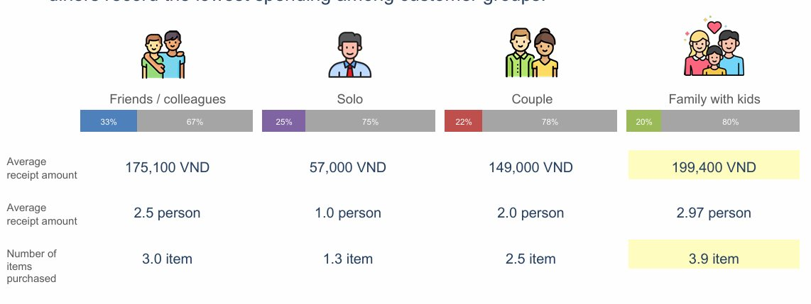 Xét về đối tượng khách hàng, nhóm bạn bè và đồng nghiệp chiếm tỷ trọng lớn nhất trong các lượt ghé thăm, tuy nhiên, nhóm khách hàng gia đình có trẻ em mới là đối tượng chịu chi nhất. Trung bình, một nhóm khách gia đình chi tiêu khoảng 199.400 đồng cho mỗi lần ăn, cao hơn đáng kể so với mức chi tiêu của nhóm bạn bè (khoảng 175.100 đồng) hay nhóm khách đi một mình (57.000 đồng).
