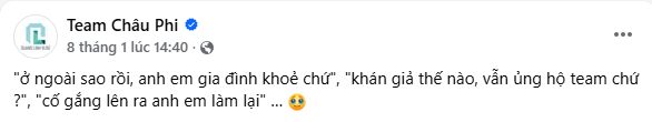 Trước đó trên fanpage của Team Châu Phi cũng đăng tải những dòng chia sẻ, được cho là lời hỏi thăm của Quang Linh Vlogs: “Ở ngoài sao rồi, anh em gia đình khỏe chứ?", "Khán giả thế nào, vẫn ủng hộ team chứ?",...