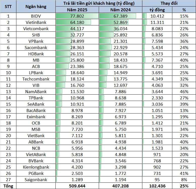 Xét về quy mô tuyệt đối, nhóm ngân hàng quốc doanh tiếp tục dẫn đầu về chi phí trả lãi do quy mô huy động lớn. BIDV đứng đầu hệ thống với 77.802 tỷ đồng tiền lãi trả cho người gửi, tăng 15% so với năm trước. VietinBank xếp ngay sau với 64.180 tỷ đồng, tăng 21%, trong khi Vietcombank ghi nhận 44.117 tỷ đồng, tăng 22%.