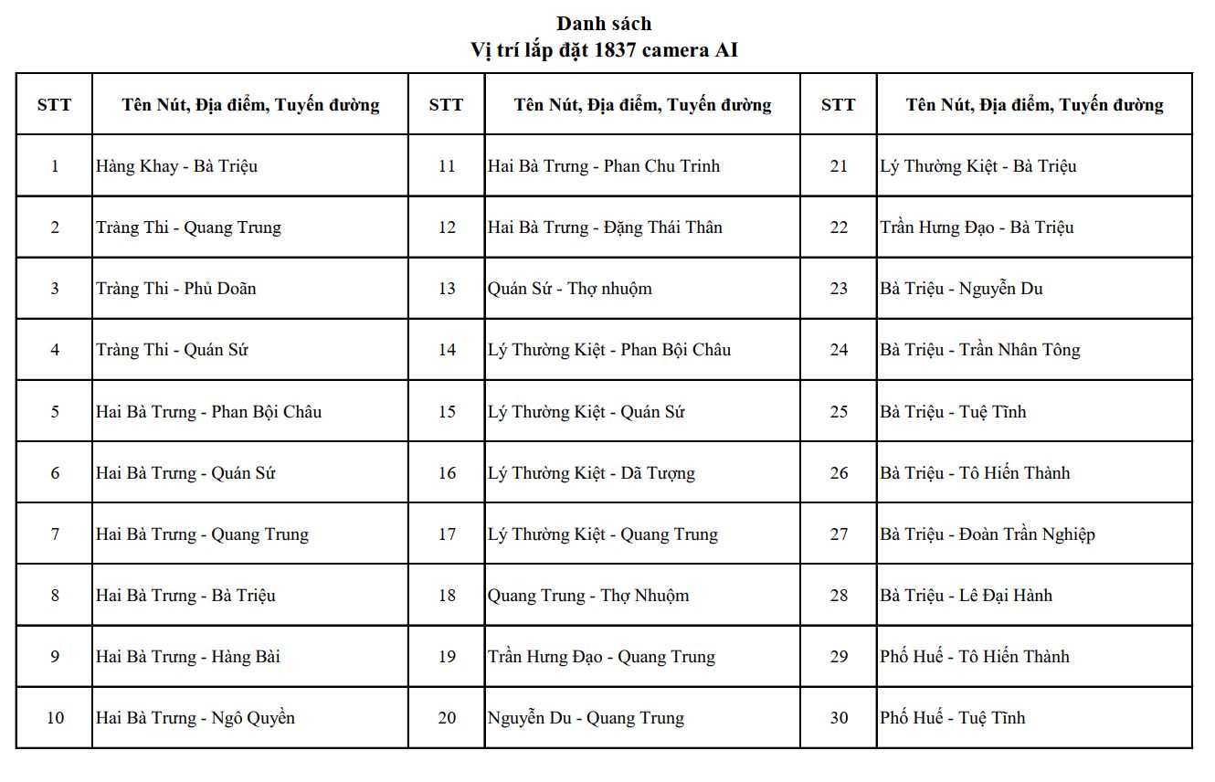 Vị trí lắp đặt 1.837 camera AI phục vụ xử lý vi phạm trong lĩnh vực trật tự, an toàn giao thông, trật tự đô thị, trật tự công cộng, như sau: